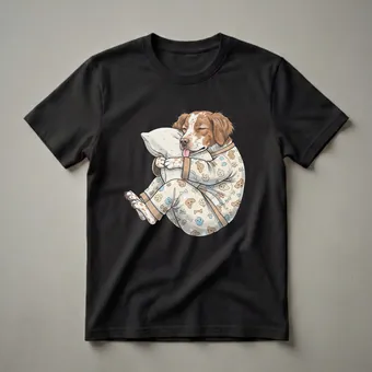 Brittany Spaniels, known for their energetic and playful nature, are captured here in a moment of deep slumber. This graphic tee showcases a charming illustration of a Brittany dog, complete with its signature speckled coat, dressed in adorable pajamas adorned with teddy bears, bones, and paw prints. The dog is curled up, hugging a fluffy pillow with its eyes closed and tongue playfully peeking out, embodying ultimate relaxation. This shirt is a delightful choice for Brittany Spaniel owners who appreciate the breed's spirited personality but also cherish those quiet, cozy moments. It makes a thoughtful gift for any dog mom or dog dad who understands the joy of a sleeping pup. Imagine wearing this comfortable tee while enjoying a lazy Sunday morning or settling in for a cozy night. The design captures the endearing contrast between the breed's active reputation and its capacity for sweet, peaceful rest. This pajama-themed dog shirt is a unique way to express your love for your canine companion and your appreciation for a good night's sleep. It's a staple in the collection for anyone who believes dogs make life better, especially when they're dreaming.