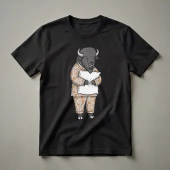 Buffalo roam the plains of North America, known for their impressive horns and shaggy coats. This graphic tee captures a different side of the majestic creature, depicting a buffalo dressed in a whimsical pajama set. The pajamas feature a repeating pattern of cute, sleepy-faced clouds and hearts on a light tan background, complete with piped trim. The buffalo itself is rendered in a detailed, sketch-like style, with a thick, dark mane and horns, clutching a fluffy white pillow. This t-shirt is a playful nod to anyone who loves animals and enjoys a good night's sleep or a cozy day indoors. It's a staple in the collection for those who appreciate unique and humorous designs. This tee works well for women, men, and kids who want to express their love for bison or simply their desire for more rest. It makes a thoughtful gift for friends or family members who are always ready to hit the hay or who have a soft spot for the wild. Wear this shirt to your next pajama party, a casual brunch, or simply while relaxing at home.
