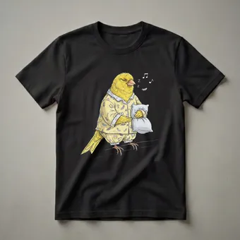 Bird lovers who appreciate a good laugh will adore this whimsical graphic tee. The design showcases a bright yellow canary, depicted as if it's ready for bed. It's dressed in a pair of light yellow pajamas adorned with a playful pattern of feathers, musical notes, tiny crowns, and little cartoon characters. The canary is shown with its eyes closed, a serene expression on its face, and is clutching a fluffy white pillow. Musical notes and 'Z's float around its head, emphasizing its sleepy state. Canaries, known for their cheerful singing, are humorously portrayed here as needing their rest. This t-shirt makes a thoughtful gift for anyone who loves birds, enjoys a cozy pajama day, or simply appreciates a unique and funny design. It's a go-to tee for casual outings, lounging at home, or even as sleepwear. Imagine gifting this to a friend who is always tired or a family member who adores their pet canary. This shirt is a conversation starter and a delightful way to express a love for our feathered friends and the simple joy of a peaceful slumber. It's a staple in any collection of quirky apparel.