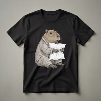 Capybaras, known for their calm and social nature, are the stars of this humorous pajama tee. This graphic shirt showcases a capybara, rendered in a charming sketch art style, looking undeniably sleepy as it clutches a fluffy white pillow. The capybara is depicted wearing a pair of pajamas adorned with a repeating pattern of small hearts, adding a touch of whimsy to its slumberous pose. Capybaras are the largest rodents in the world and are native to South America, often found near bodies of water where they enjoy swimming and lounging. This t-shirt is a thoughtful gift for anyone who appreciates the laid-back lifestyle of these gentle giants, or for those who simply love a good nap. It's a go-to tee for lazy mornings, cozy evenings, or even as comfortable sleepwear. Whether you're a fan of unique animal designs or just looking for a fun and relatable shirt, this capybara pajama tee is sure to bring a smile. It's a staple in the collection for those who understand the universal appeal of a good night's sleep and the charm of a sleepy rodent.