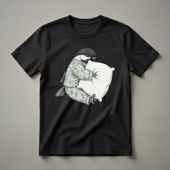 This eye-catching graphic tee features a charming illustration of a Black-capped Chickadee, a small bird known for its distinctive black cap and bib, white cheeks, and gray wings. The chickadee is depicted in a whimsical style, wearing a light green pajama set adorned with a playful pattern of leaves, clouds, and pumpkins. It's shown snuggled up, hugging a large white pillow, embodying a cozy and sleepy demeanor. Chickadees are common in North American forests and woodlands, often seen flitting between trees and known for their acrobatic foraging. This t-shirt captures that relatable feeling of wanting to stay cozy and comfortable, making it a go-to tee for anyone who appreciates a good night's sleep or simply loves birds. It makes a thoughtful gift for bird watchers, nature enthusiasts, or anyone who enjoys a touch of humor in their loungewear. Wear this shirt to relax at home, during a lazy weekend brunch, or even to a casual pajama party. It's a delightful piece of apparel that brings a smile and a sense of comfort.