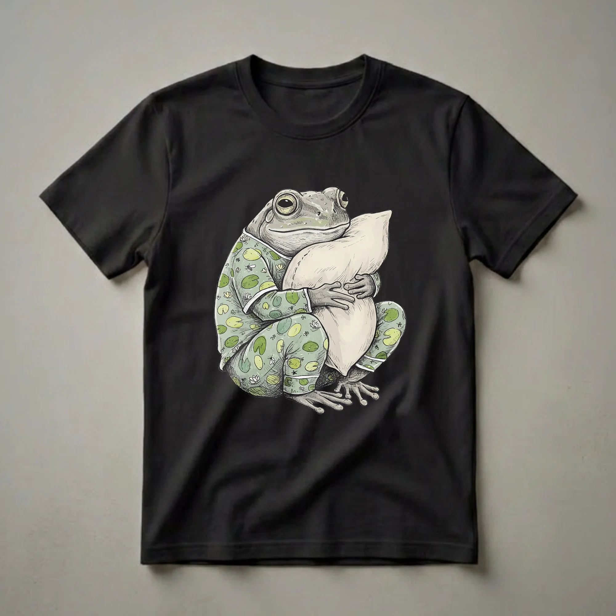Frog lovers who appreciate a good night's sleep will reach for this whimsical pajama tee. The design showcases a charming, hand-drawn frog character dressed in light green pajamas adorned with lily pads and dragonflies. This amphibian is depicted in a cozy embrace with a plush pillow, its eyes half-closed in a state of sleepy contentment. Frogs, known for their nocturnal habits and love of damp environments, often inhabit ponds and wetlands, where lily pads provide a natural resting place. This shirt captures that serene, sleepy essence, making it a delightful addition to any loungewear collection. It's a perfect gift for anyone who enjoys a bit of humor and a lot of comfort, whether they're kids or adults. Imagine wearing this to a lazy weekend brunch or during a cozy movie night. The playful artwork and comfortable theme make this pajama shirt a go-to for relaxation. It’s a unique way to express a love for these fascinating creatures and their peaceful, sleepy demeanor. This tee is a thoughtful gift for the frog enthusiast in your life who cherishes quiet moments and a good night's rest.