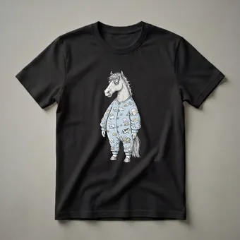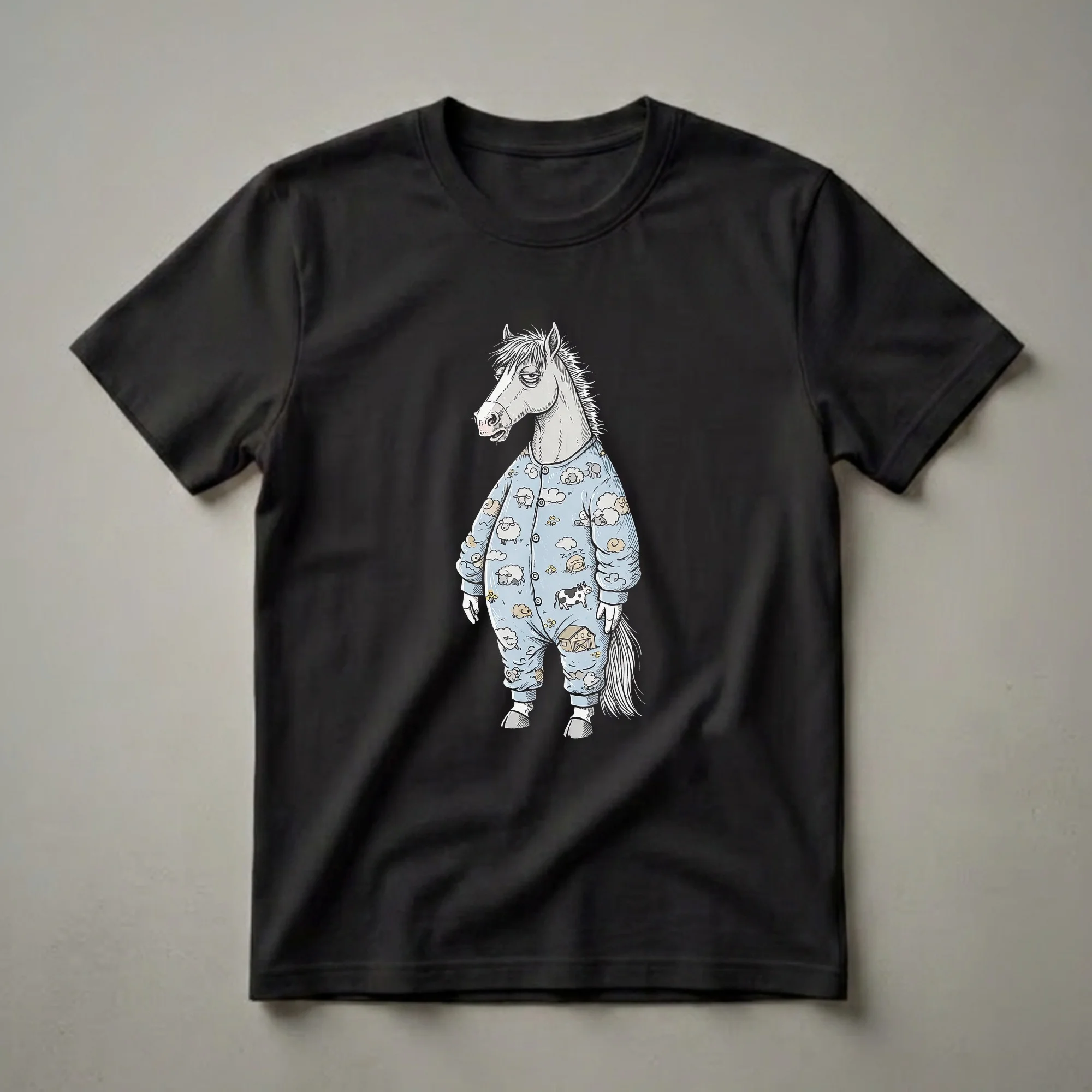 Horse owners and animal lovers who appreciate a good laugh will reach for this eye-catching tee. The design showcases a cartoon horse looking utterly exhausted, dressed in a light blue pajama set. These pajamas are adorned with a whimsical pattern of fluffy clouds, playful sheep, a contented cow, and a charming little barn. The horse's droopy eyes and disheveled mane perfectly capture the feeling of being completely worn out. This graphic shirt is a thoughtful gift for anyone who identifies with the struggle of waking up or simply enjoys humorous animal designs. It's a staple in any collection for those who love to express their personality through their clothing. Wear this t-shirt to game nights, casual brunches, or simply while relaxing at home. The humor in this design resonates with anyone who has ever felt like they needed just a few more hours of sleep, making it a relatable and amusing choice for men, women, and kids alike. It's a fun way to show off your love for horses and a good sense of humor.
