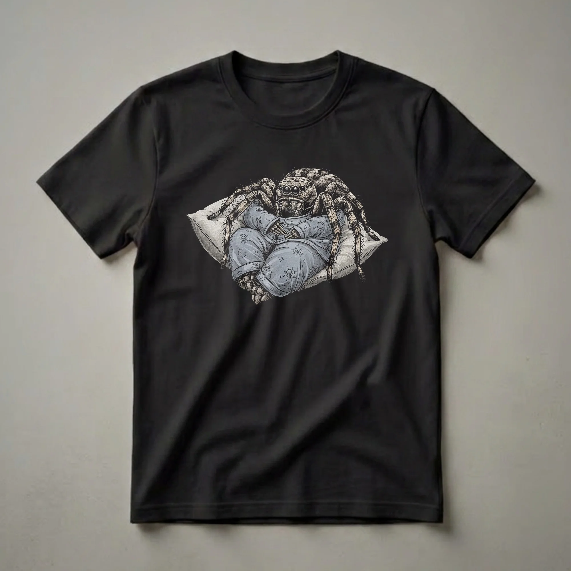 - Features a humorous illustration of a sleepy jumping spider in pajamas, a unique graphic tee for arachnid fans.