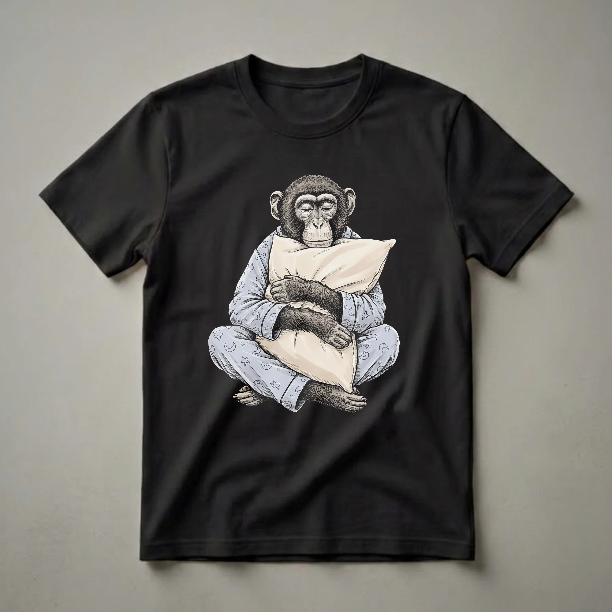 - This graphic tee features a humorous illustration of a sleepy macaque chimp in pajamas.