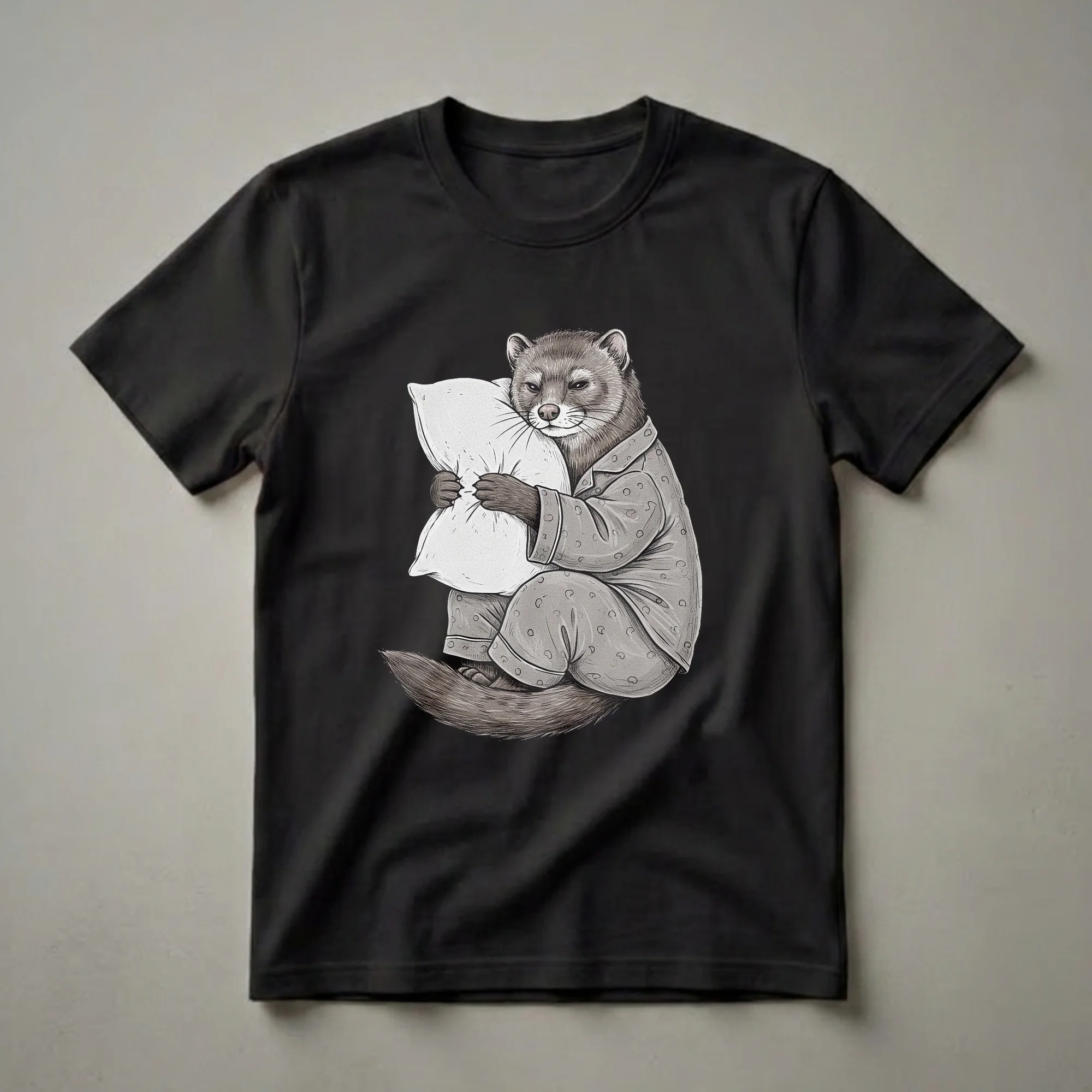 Minks, known for their sleek bodies and playful nature, are often depicted in more active roles, but this graphic tee celebrates their quieter side. This eye-catching design features a charming mink character dressed in polka-dot pajamas, clutching a fluffy white pillow with a look of sleepy contentment. The artistic style, reminiscent of vintage illustrations, gives the mink a distinct personality, making this shirt a standout piece for any animal lover. Minks are semi-aquatic mammals belonging to the Mustelidae family, which also includes weasels, otters, and ferrets. They are skilled hunters and swimmers, but even the most energetic creature needs its rest. This t-shirt captures that universal desire for comfort and sleep. It's a thoughtful gift for women and men who appreciate quirky humor and animal-themed apparel. Imagine gifting this to a friend who always looks forward to bedtime or a family member who adores unique graphic tees. This shirt works well for casual outings, lounging at home, or even as part of a fun pajama set. It’s a go-to tee for anyone who understands the joy of a cozy night in. The detailed illustration ensures that this sleepy mink will bring a smile to anyone's face, making it a truly memorable piece of clothing.