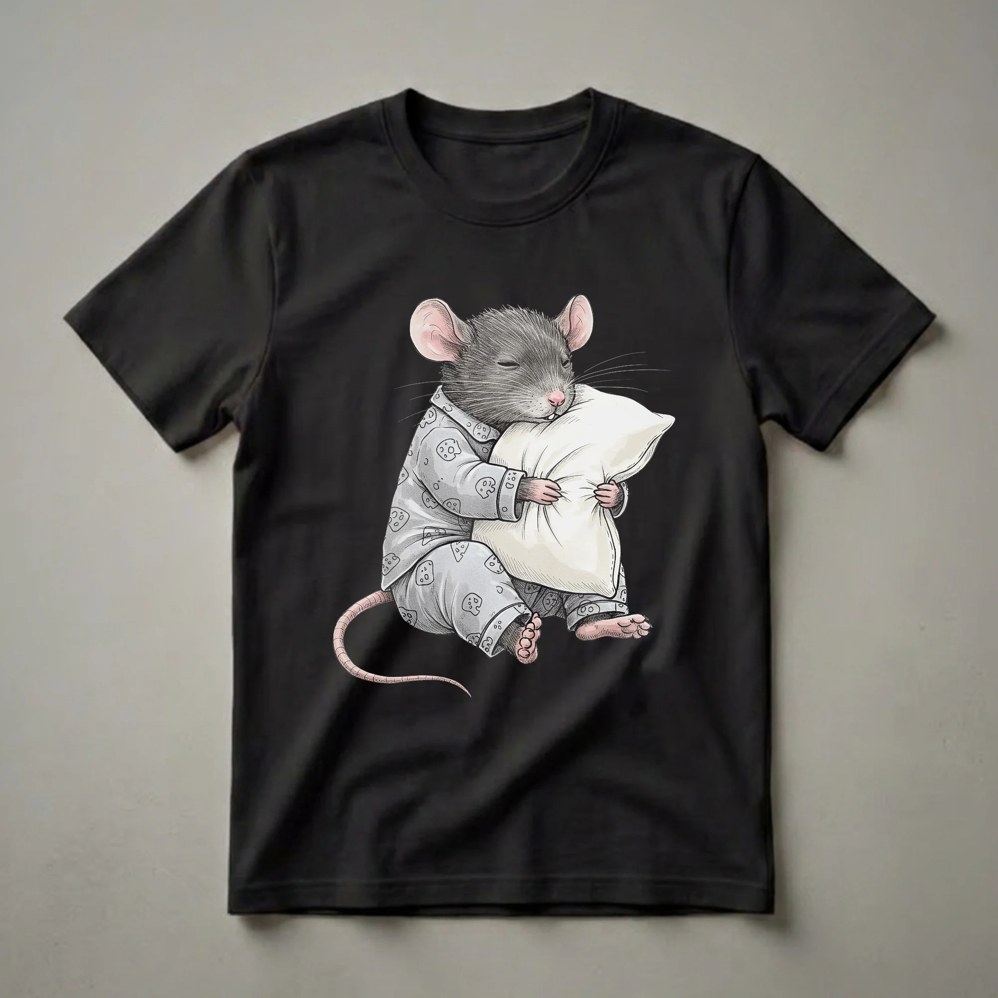 Mice, known for their quick movements and nocturnal habits, are often associated with scurrying through the night. However, this charming illustration captures a different side of these small rodents: a desire for rest and comfort. This graphic tee showcases a detailed drawing of a grey mouse, complete with whiskers and large ears, dressed in a grey pajama set adorned with a playful cheese pattern. The mouse is depicted in a relaxed pose, eyes closed, sound asleep while tightly hugging a fluffy white pillow. The intricate linework and subtle coloring bring the scene to life, highlighting the soft texture of the pajamas and the plushness of the pillow. This shirt is a thoughtful gift for anyone who appreciates a good night's sleep or finds humor in the idea of a mouse dreaming of cheese. It's a staple in the collection for those who love animals and a good chuckle. This tee works well for lounging at home, wearing to a casual game night, or as a fun addition to your sleepwear collection. Imagine wearing this to a cozy movie marathon or a relaxed brunch with friends, sparking smiles and conversations about the simple joys of comfort and a peaceful slumber. The detailed artwork makes this more than just sleepwear; it's a wearable piece of art that celebrates the universal love for a good nap.