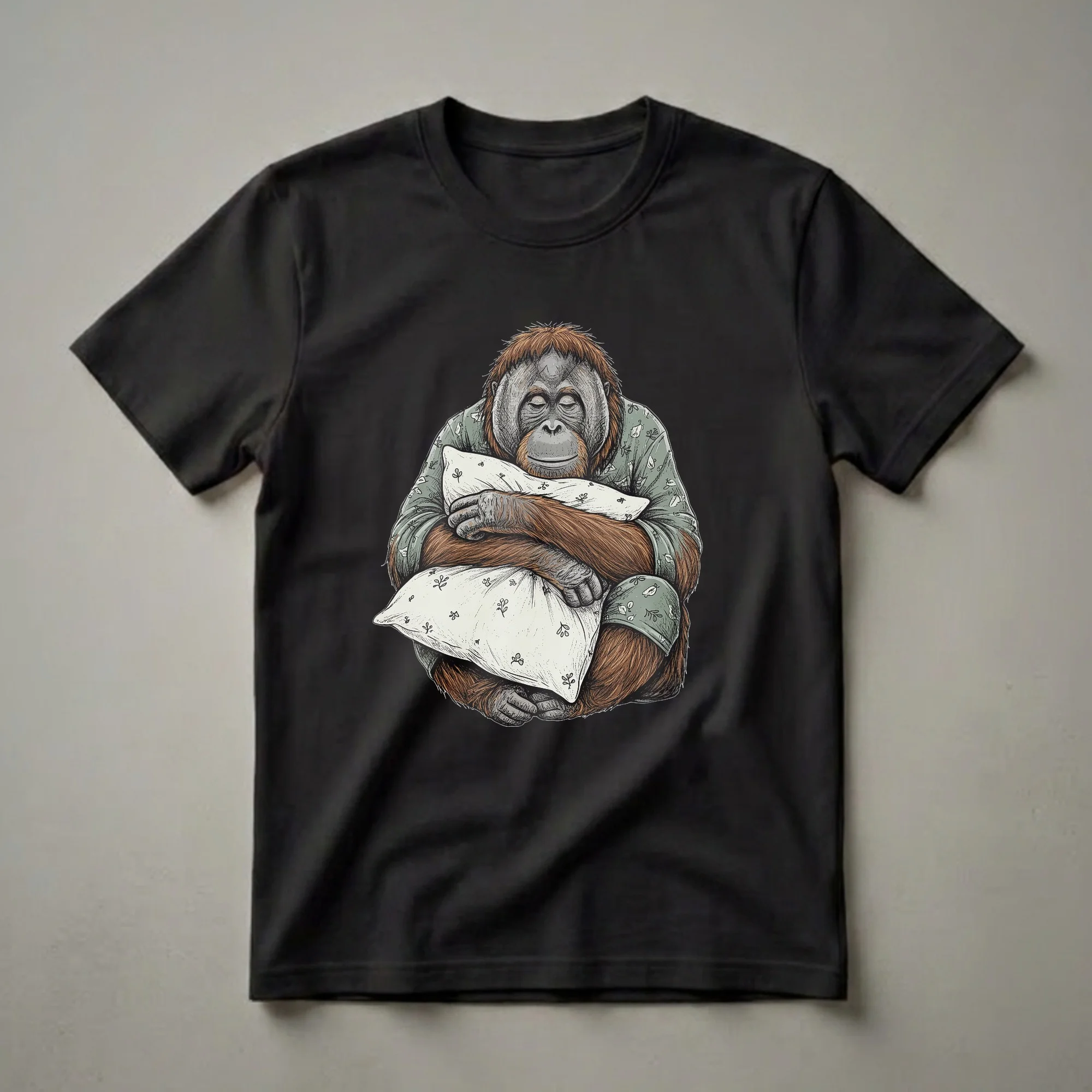 Orangutans, known for their gentle nature and arboreal lifestyle in the rainforests of Borneo and Sumatra, are depicted here in a humorous, sleepy pose. This graphic tee captures the essence of wanting to curl up and rest, much like these intelligent primates often do in their nests. The illustration features a detailed orangutan dressed in a mint green pajama set adorned with a subtle floral pattern, complete with a matching headband. It’s hugging two plush pillows, eyes closed in peaceful slumber. This t-shirt is a playful nod to anyone who cherishes their downtime and enjoys a good night's sleep or a lazy morning. It's a staple in the collection for those who appreciate unique animal art with a touch of humor. This shirt works well for women and men who identify with the desire for comfort and relaxation. It makes a thoughtful gift for friends or family members who are always ready for a nap or who simply love orangutans. Wear this tee to your next pajama party, a casual brunch, or simply while lounging at home.