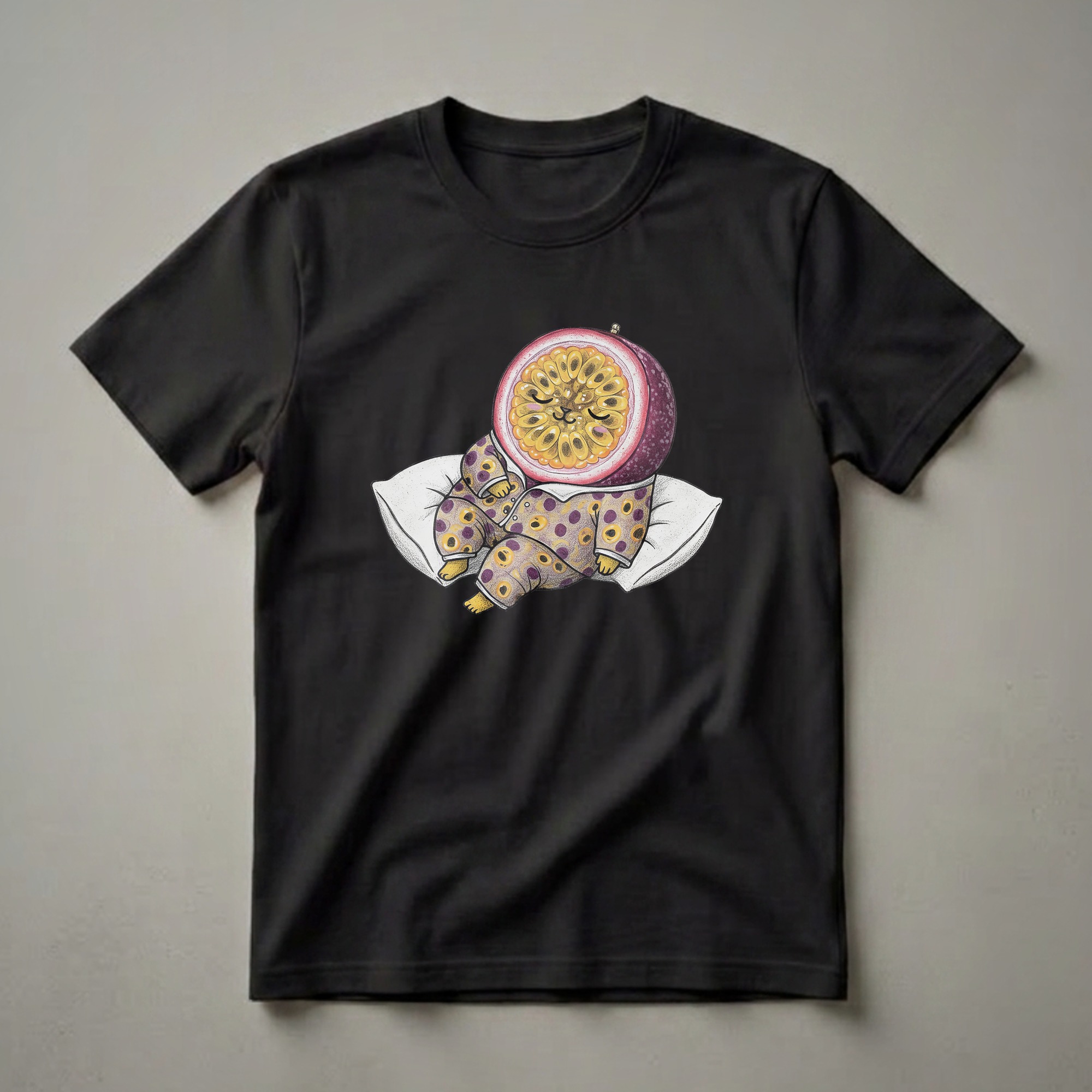 Passion fruit lovers who appreciate a touch of whimsy will adore this unique graphic tee. The design showcases a halved passion fruit, its vibrant yellow pulp and seeds clearly visible, nestled on a soft white pillow. This fruity character is depicted wearing adorable polka dot pajamas in shades of purple and yellow, with its eyes closed in peaceful slumber. The passion fruit, scientifically known as Passiflora edulis, is native to South America and is celebrated for its tropical aroma and tangy flavor. This t-shirt captures the essence of relaxation and the simple joy of a good night's sleep, making it a delightful addition to any casual wardrobe. It's a thoughtful gift for anyone who loves tropical fruits, enjoys a cozy pajama aesthetic, or simply needs a reminder to embrace moments of rest. This shirt works well for lounging at home, casual outings, or as a conversation starter among fellow fruit enthusiasts. The playful illustration brings a smile to your face, embodying a carefree spirit. This tee is a go-to for those who find joy in the sweeter, more relaxed aspects of life.