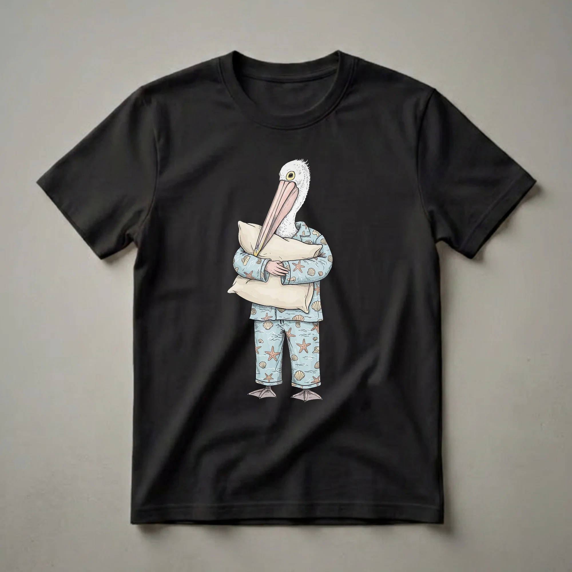 Pelicans, known for their distinctive throat pouches and coastal habitats, are often seen as majestic birds of the sea. However, this graphic tee offers a humorous twist, depicting a pelican in full pajama attire, complete with a seashell and wave pattern. The bird is shown clutching a fluffy pillow, its eyes wide with a sleepy expression, suggesting a desire for rest. This t-shirt is a playful nod to those who cherish their sleep, whether they are bird enthusiasts or simply appreciate a good night's rest. The detailed illustration captures the essence of a cozy, slumbering creature, making it a unique addition to any casual wardrobe. It's a thoughtful gift for anyone who loves birds or finds joy in the simple act of sleeping. This tee works well for lounging at home, casual outings, or as a conversation starter. Imagine wearing this to a relaxed game night or a lazy Sunday brunch, sparking smiles and shared appreciation for its whimsical design. The pajama pattern itself, featuring starfish and various shells against a light blue, wavy background, adds a charming, beachy vibe to the overall theme. This shirt is a staple for those who understand the importance of a good nap and want to express it with a touch of humor and style. It's a go-to tee for anyone who identifies with the pelican's sleepy demeanor.
