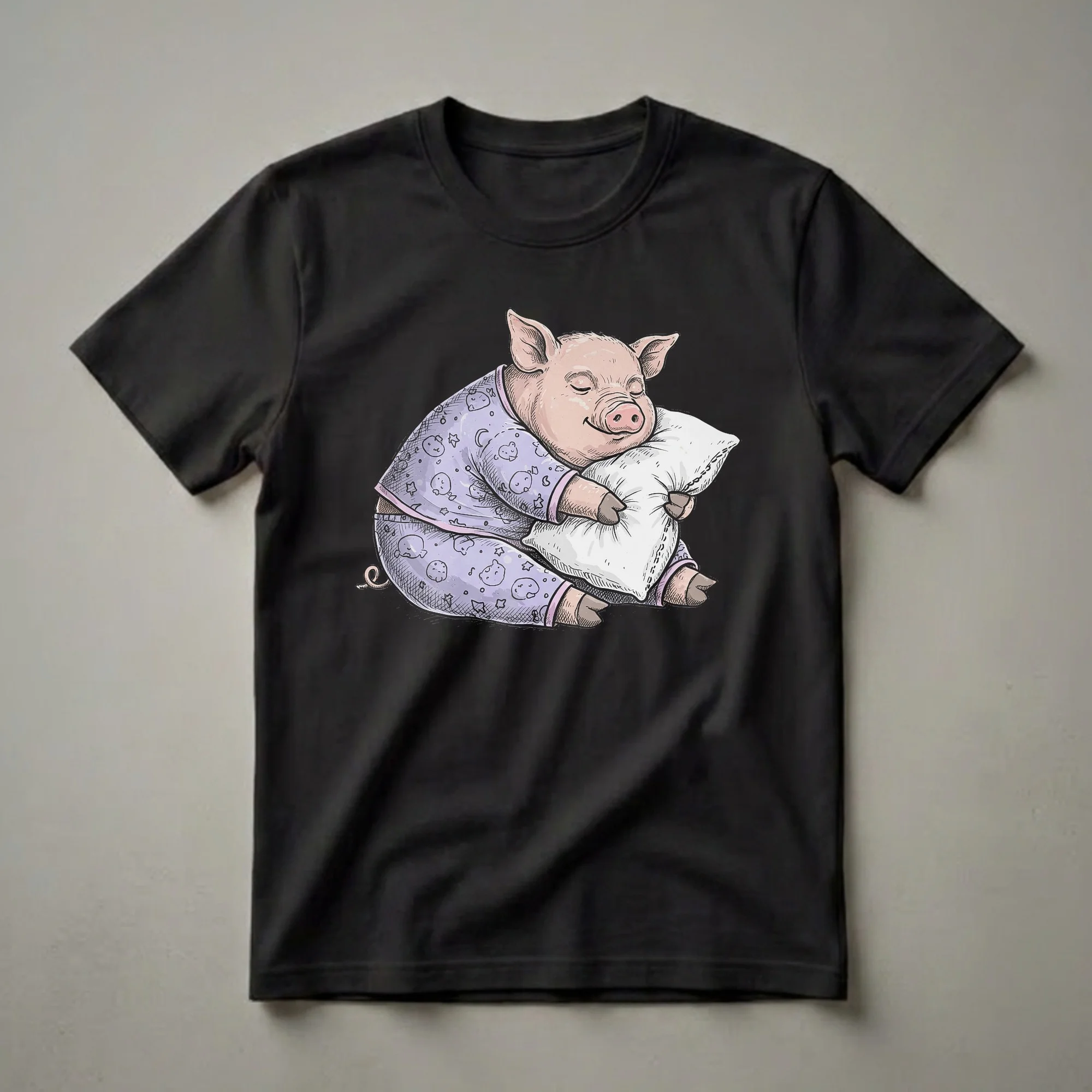 Pigs are known for their intelligence and social nature, often enjoying comfortable environments. This charming graphic tee captures that essence with a delightful illustration of a pig nestled into a fluffy pillow, fast asleep. The pig is depicted wearing cute purple pajamas adorned with whimsical patterns of moons, stars, and sleepy-faced characters, complete with pink trim. This sleepy pig shirt is a playful nod to the universal love for a good night's sleep or a cozy nap. It's a go-to tee for anyone who appreciates a bit of humor and comfort in their loungewear. This t-shirt makes a thoughtful gift for girls and women who adore pigs or simply love to express their desire for rest. Imagine wearing this to a casual game night or simply lounging at home on a lazy weekend morning. The detailed sketch style, combined with soft watercolor-like coloring, gives this design a unique and endearing appeal. It’s a staple in any collection of fun, character-driven apparel, a thoughtful choice for those who find joy in the simple pleasures of life, like a warm bed and sweet dreams. This shirt is a reminder to embrace relaxation and find comfort in your downtime.