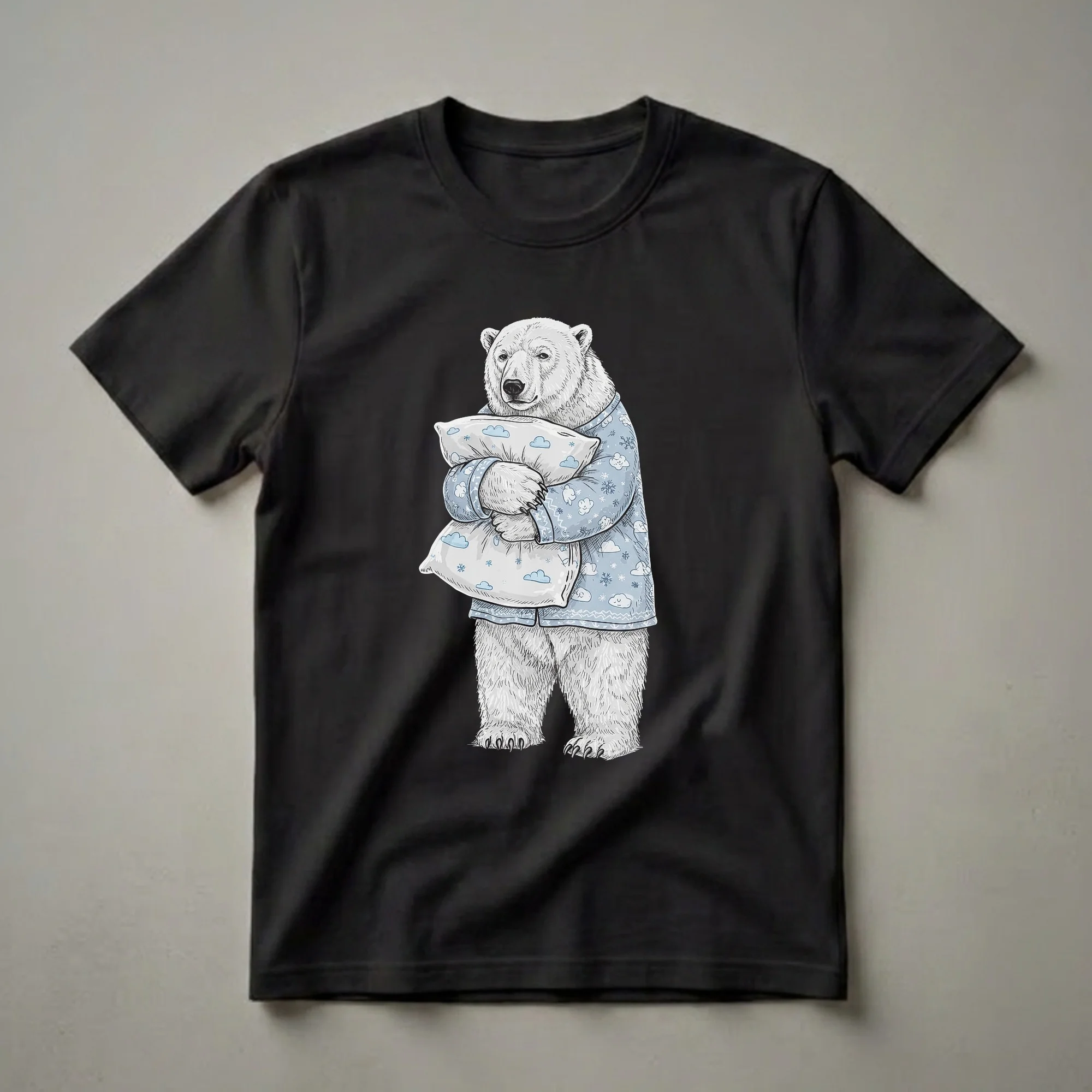 Polar bear owners who appreciate a good laugh will reach for this eye-catching graphic tee. The illustration showcases a charming polar bear, depicted in a whimsical style, dressed in light blue pajamas adorned with clouds and snowflakes. This sleepy bear is embracing two fluffy pillows, embodying the universal desire for comfort and rest. Polar bears, known for their impressive size and adaptation to Arctic environments, often spend significant time resting to conserve energy in their harsh habitats. This shirt captures that spirit of relaxation in a playful way. It's a thoughtful gift for anyone who loves animals, especially those who identify with the bear's sleepy demeanor. Imagine wearing this t-shirt to a casual game night or while lounging at home. This comfortable tee is a thoughtful choice for women, men, and kids who enjoy a touch of humor in their wardrobe. It makes a wonderful present for birthdays or just because, bringing a smile to the face of the recipient. The design is a conversation starter, sure to delight fellow animal enthusiasts and pajama lovers alike.