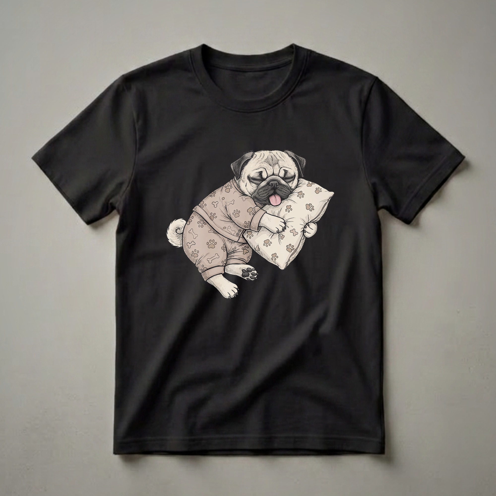 Pug owners know the breed's endearing wrinkles and tendency to nap. This eye-catching graphic tee showcases a pug sound asleep, dressed in cozy pajamas adorned with paw prints and bones, clutching a pillow. Pugs, originating from China, are known for their charming, sometimes stubborn, personalities and their love for comfort, making this design relatable for anyone who cherishes their canine companions. This t-shirt is a thoughtful gift for pug moms, pug dads, or any kid who adores these lovable dogs. It's a staple in the collection for those who appreciate a good night's sleep or simply love the humor of a dog in pajamas. Wear this shirt to relax at home, during your next pajama party, or to a casual outing where you want to share your passion for pugs. It’s a comfortable and fun way to express your affection for your furry friend, celebrating the joy that pugs bring into our lives. This tee is a go-to for lounging and showing off your pug pride.