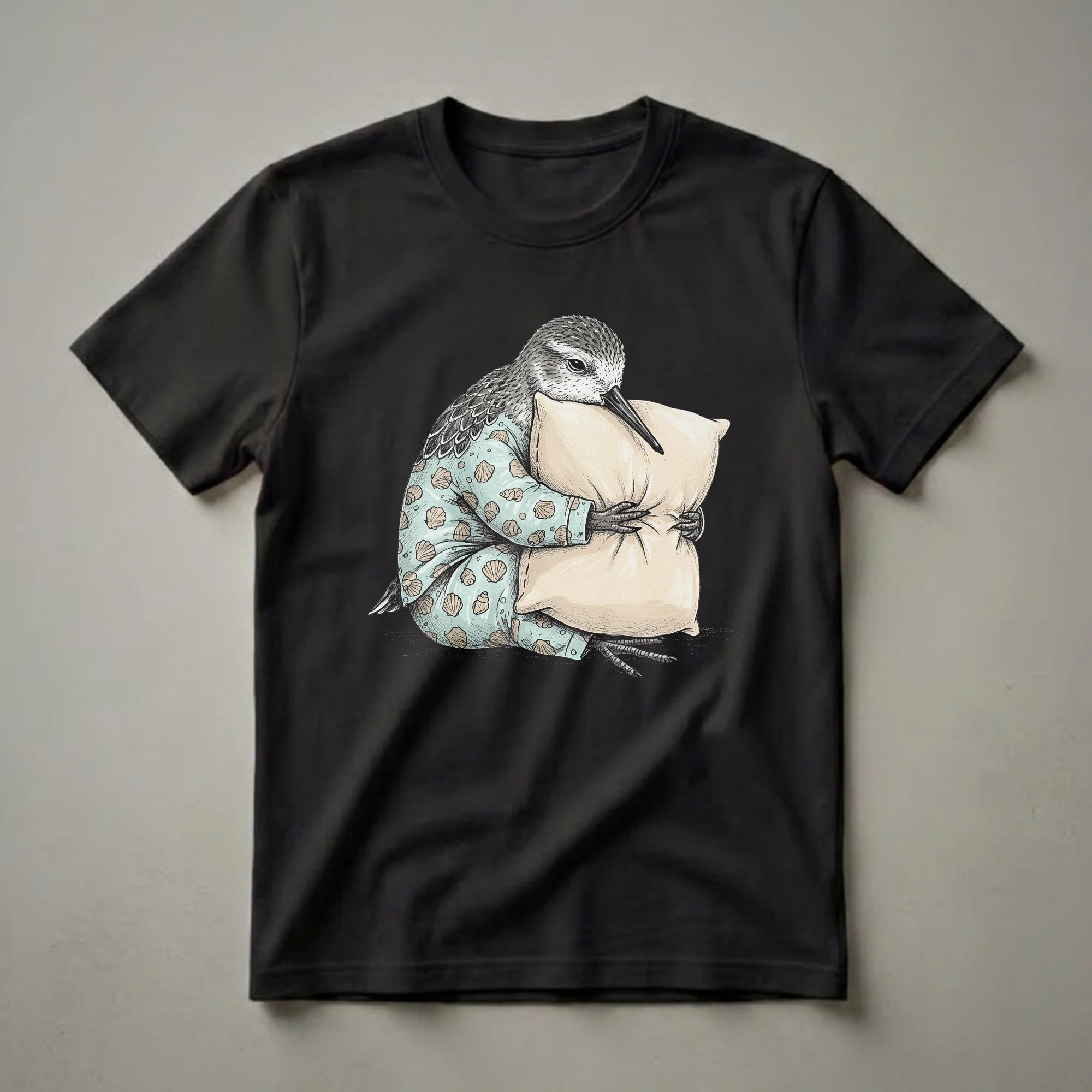 Bird watchers and nature enthusiasts who appreciate a touch of humor will adore this unique graphic tee. The illustration showcases a sandpiper, a small wading bird known for its long beak and habit of foraging along shorelines, depicted in a state of ultimate relaxation. This particular sandpiper is dressed in charming light blue pajamas adorned with a repeating pattern of various seashells, from delicate scallops to spiraled conchs. It's shown curled up, tightly hugging a soft, beige pillow, its spindly bird feet tucked beneath it. The detailed linework and subtle coloring bring the scene to life, highlighting the texture of the bird's feathers and the crinkles of the pillow. Sandpipers are often found in coastal areas and wetlands, and this image playfully imagines one enjoying a quiet moment away from its usual habitat. This t-shirt makes a thoughtful gift for anyone who loves birds, the beach, or simply enjoys a good night's sleep. It's a go-to tee for casual outings, lounging at home, or even as a conversation starter at a game night. Imagine wearing this to your next brunch or while relaxing on a lazy weekend morning. The design captures a whimsical and relatable feeling of wanting to snuggle up with a pillow.