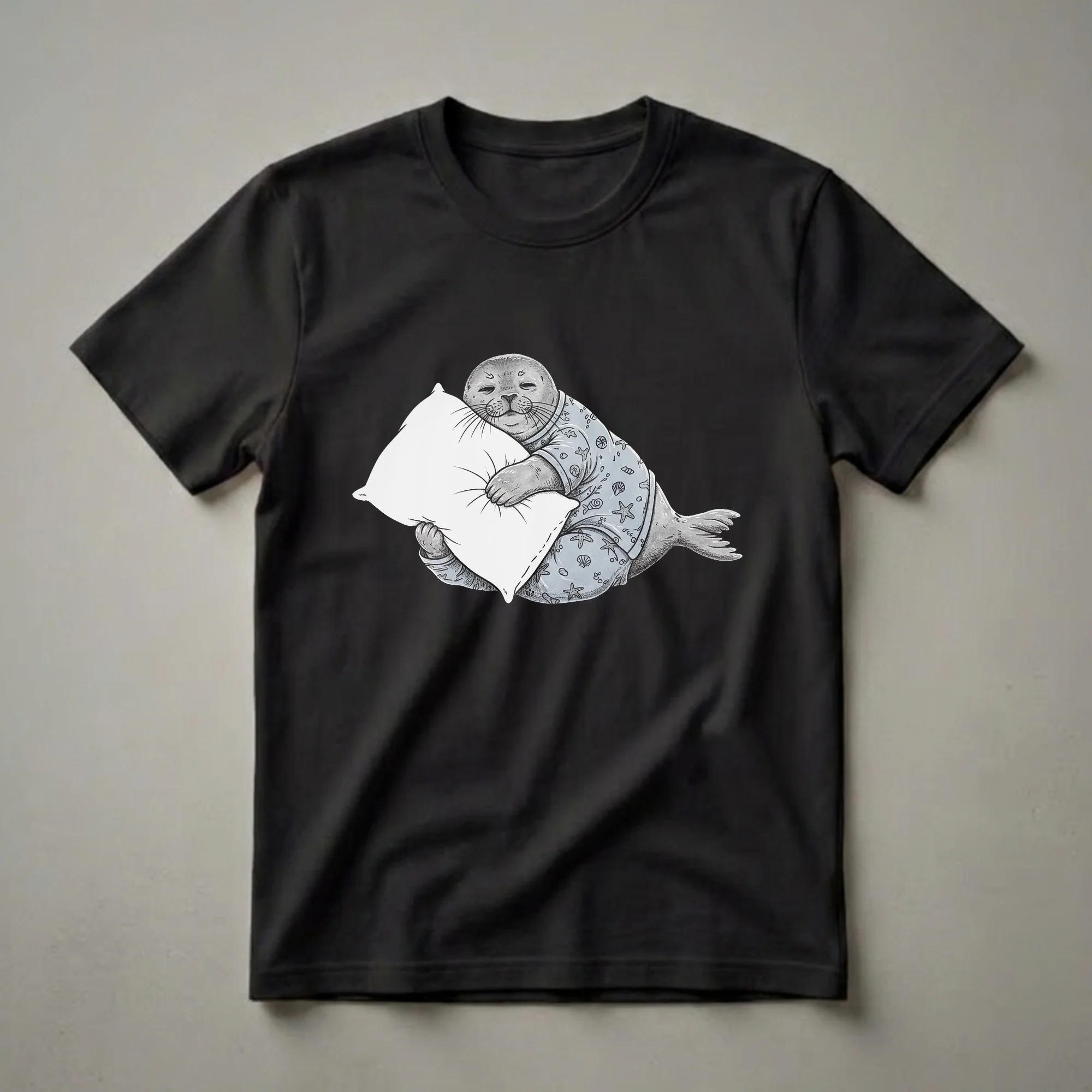 Sleepy seal enthusiasts who appreciate a good nap will reach for this eye-catching graphic tee. The design showcases a charming seal, depicted in a sketch art style, wearing light blue pajamas adorned with a pattern of seashells, starfish, and bubbles. This marine mammal is shown in a relaxed pose, tightly hugging a plush white pillow, its eyes half-closed in a state of blissful slumber. Seals, known for their aquatic lifestyle and playful nature, often spend significant time resting on land or ice floes, making this depiction relatable for anyone who cherishes downtime. This t-shirt is a thoughtful gift for women and men who love animals or simply enjoy a cozy night's sleep. It's also a fun present for kids and girls who adore cute creatures. Imagine wearing this comfortable shirt to a casual game night or while lounging at home on a lazy Sunday morning. The playful design captures the essence of relaxation and the simple joy of a comfortable pajama set, making it a staple in any casual wardrobe.