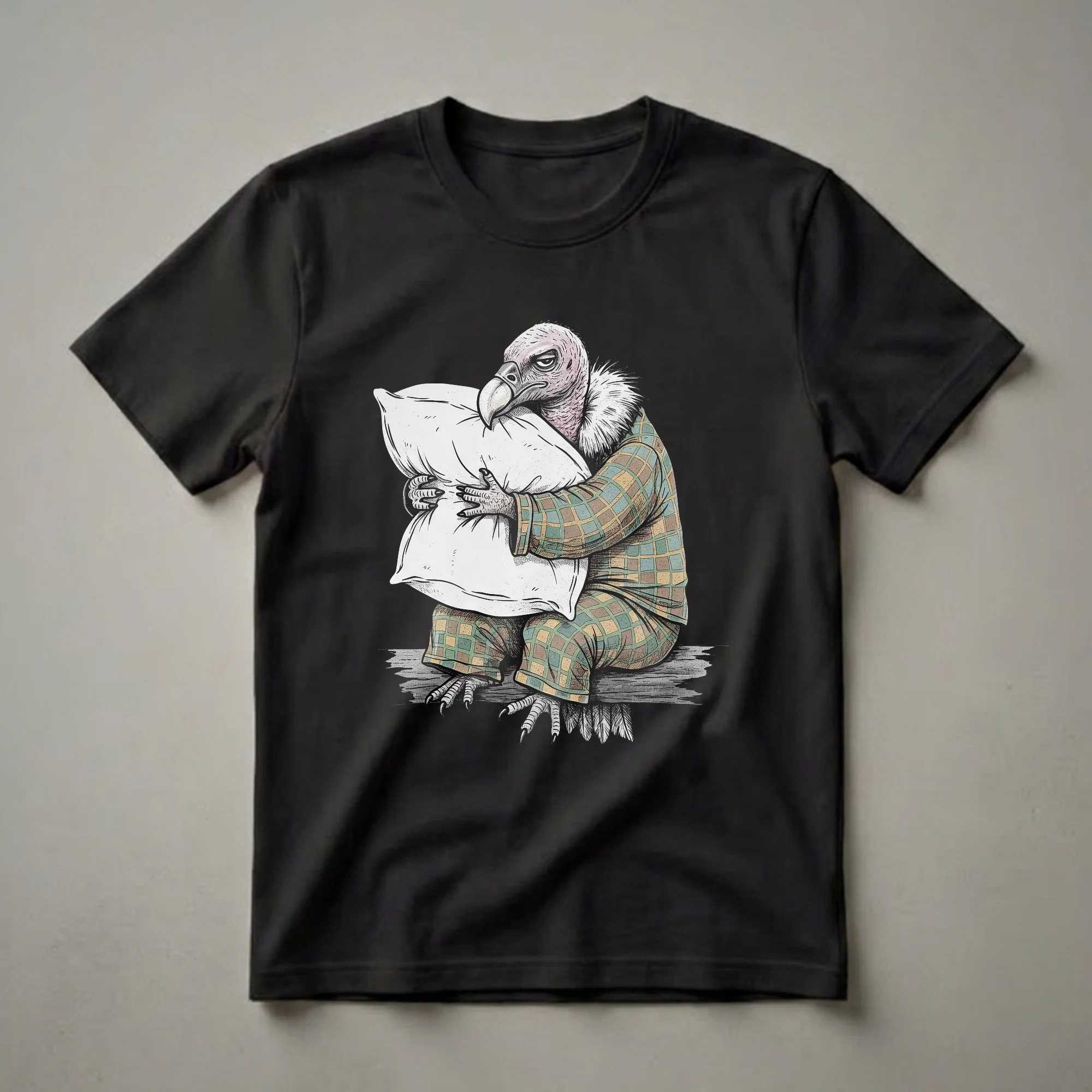 Vultures, often misunderstood for their scavenging nature, are depicted here in a surprisingly relatable moment of slumber. This eye-catching graphic tee showcases a cartoon vulture, complete with its distinctive bald head and sharp beak, clad in cozy plaid pajamas. It clutches a large, fluffy pillow, its expression one of deep sleepiness or perhaps mild annoyance at being disturbed. The artwork features a sketchy, illustrative style with a limited color palette, giving it a vintage yet humorous feel. Vultures are fascinating birds, known for their keen eyesight and their vital role in ecosystems as nature's clean-up crew. Species like the Turkey Vulture can soar for hours on thermal air currents, covering vast distances in search of carrion. This t-shirt is a playful nod to those who appreciate a good night's sleep or simply enjoy a quirky sense of humor. It's a staple in the collection for anyone who identifies with the desire to curl up and rest. This tee works well for men and women who love animals or appreciate unique, funny designs. It makes a thoughtful gift for friends or family members who are always ready for a nap, perhaps for a birthday or just because. Wear it to your next pajama party, a casual brunch, or simply while lounging at home.