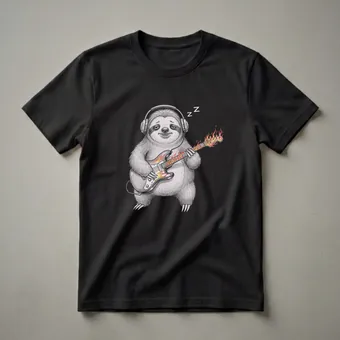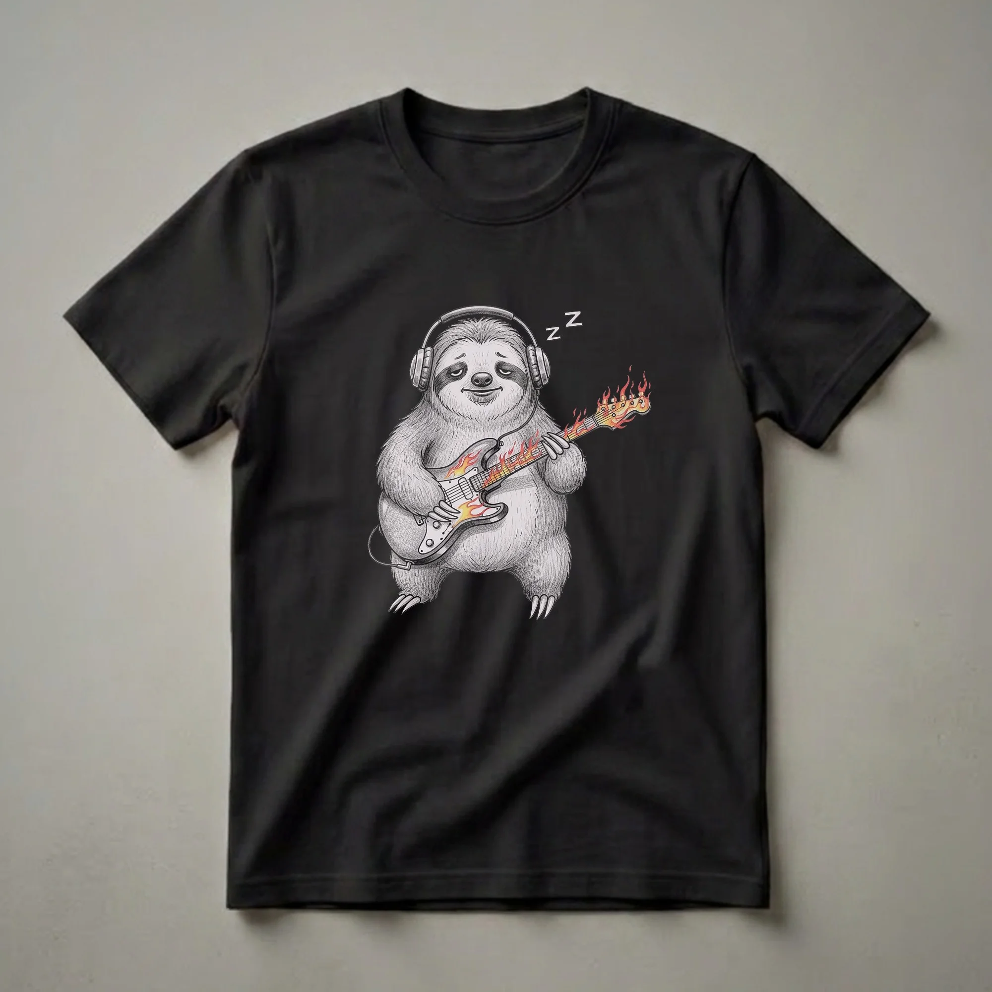 Sloths, known for their incredibly slow movement and arboreal lifestyle, are depicted here in a humorous and unexpected light. This graphic tee showcases a sloth wearing large headphones, seemingly engrossed in playing a white electric guitar that is engulfed in vibrant flames. The drawing style is reminiscent of pencil sketches, giving it a unique, artistic feel. The sloth's expression is one of sleepy contentment, with 'Zzz' symbols floating above its head, suggesting it might be playing in its sleep or just incredibly relaxed. This shirt is a thoughtful gift for guitarists who appreciate a good laugh, music students learning their craft, or anyone who loves unique animal-themed apparel. It's a conversation starter, a thoughtful choice for casual outings, jam sessions, or just lounging around. The combination of a beloved slow-moving animal with the fiery intensity of a guitar solo creates a striking visual that appeals to musicians and animal lovers alike. This t-shirt is a staple for anyone who enjoys a touch of humor with their passion for music.