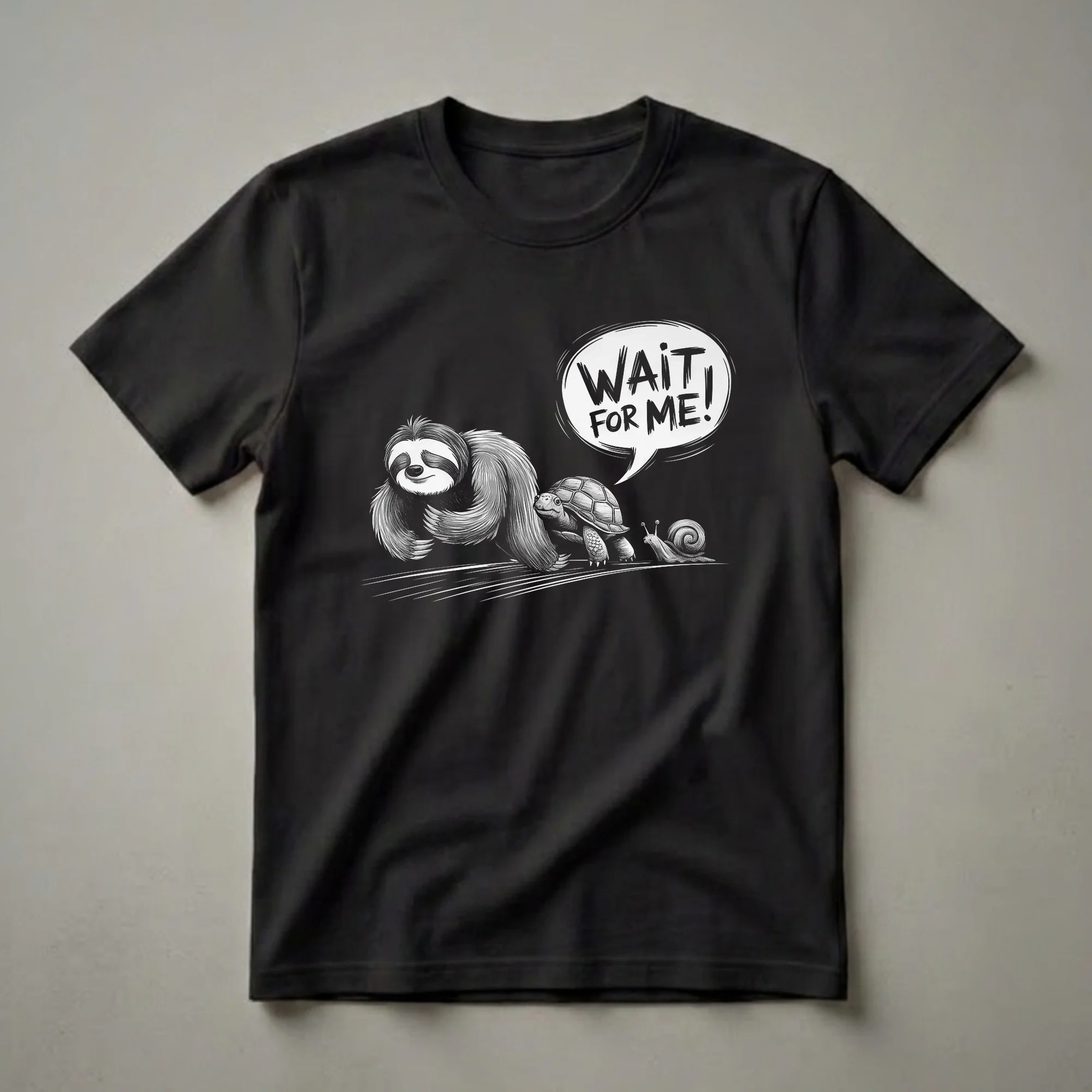 Sloths, turtles, and snails are all renowned for their leisurely pace, and this graphic tee captures that spirit with a humorous twist. The black and white illustration showcases a sloth leading the pack, with a turtle close behind and a snail trailing, all seemingly in motion. A speech bubble above them exclaims, 'WAIT FOR ME!', highlighting the relatable struggle of keeping up or the joy of taking things slow. This shirt is a playful nod to anyone who identifies with a more relaxed approach to life, or for those who enjoy a good laugh at the absurdity of speed. It makes a thoughtful gift for friends who love animals and appreciate witty, laid-back humor. Wear this tee to casual gatherings, game nights, or just when you want to express your inner sloth. The design is a staple in any collection that celebrates the lighter side of life and the charm of slow-moving creatures.