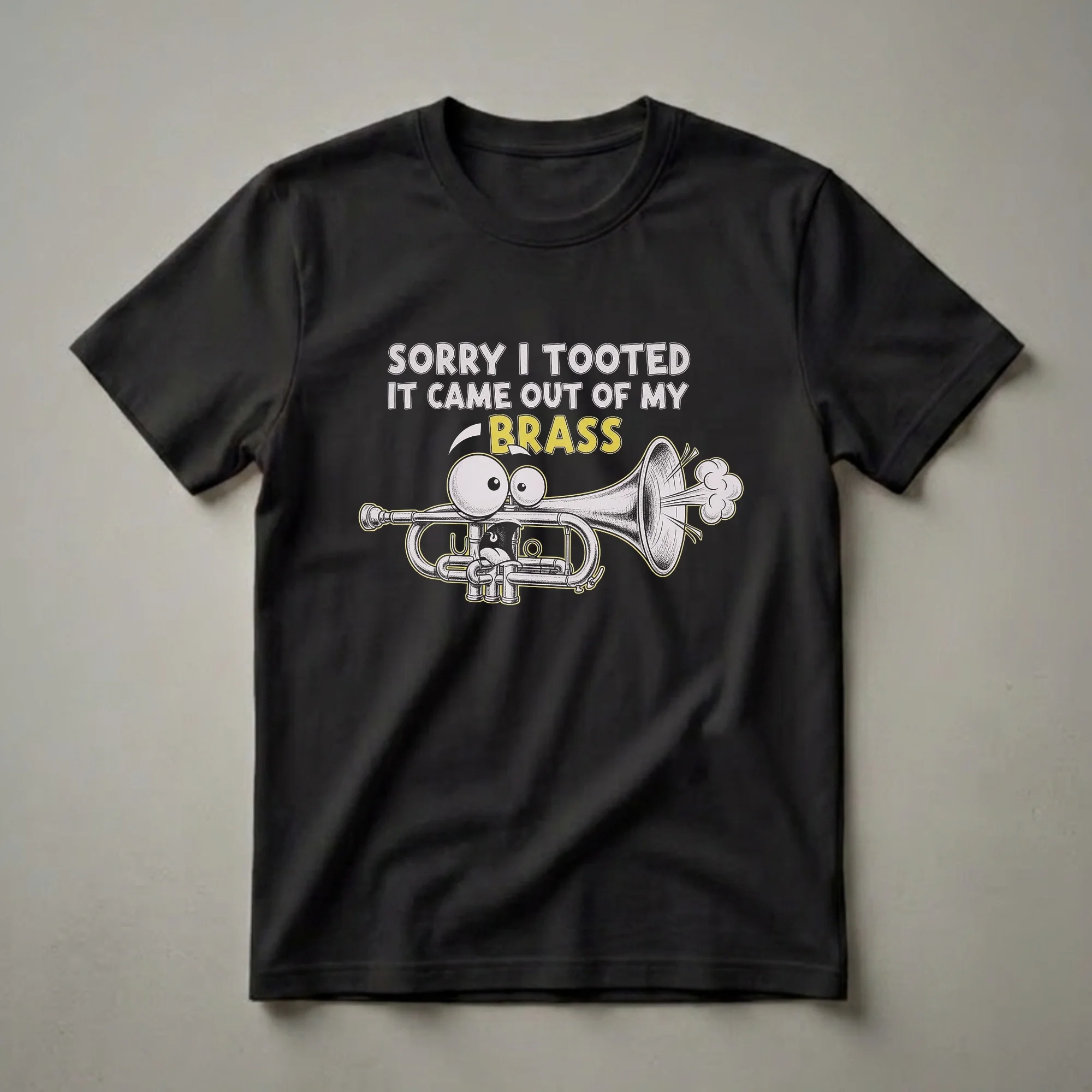Trumpet players who appreciate a good laugh will reach for this eye-catching tee. The design showcases a cartoon trumpet with a comically distressed expression, complete with wide, googly eyes and a slightly panicked mouth. Above the instrument, bold white text reads 'SORRY I TOOTED,' while the word 'BRASS' pops in a vibrant yellow, framed by the phrase 'IT CAME OUT OF MY.' This graphic tee is a playful nod to the sometimes unpredictable nature of playing a brass instrument. The trumpet itself is rendered in a detailed, sketch-like style, emphasizing its valves and bell from which a puff of air is depicted escaping. This shirt makes a thoughtful gift for any musician who plays the trumpet, trombone, tuba, or any other member of the brass family. It's a perfect way for band members, orchestra players, or jazz enthusiasts to express their passion with a touch of humor. Wear this t-shirt to band practice, a casual jam session, or just around town to spark conversations with fellow music lovers. It’s a staple in the collection for anyone who understands the unique joys and challenges of brass performance.