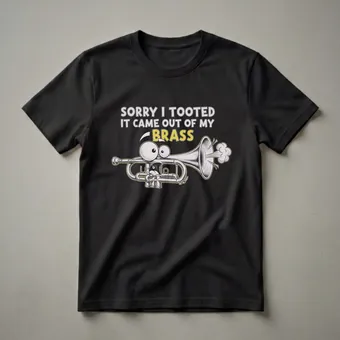 - Features a cartoon trumpet with the humorous phrase 'Sorry I Tooted It Came Out Of My Brass.'