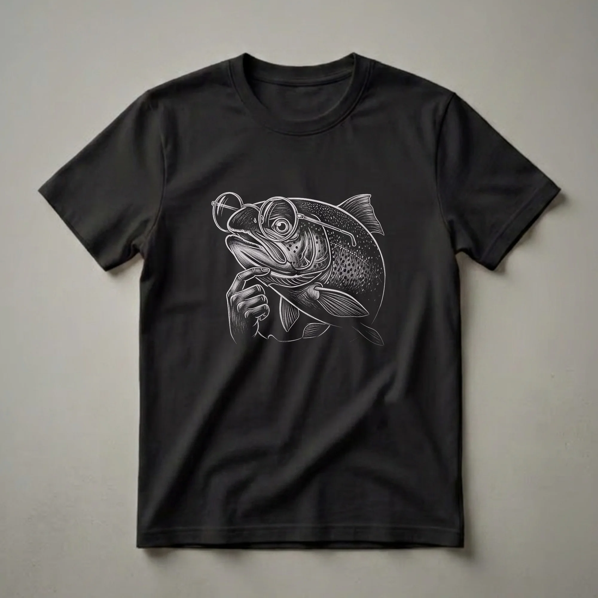 Trout anglers who appreciate a good laugh will reach for this unique graphic tee. The design showcases a stylized trout, rendered in a striking white-line art style against a solid black background. This fish isn't just swimming; it's deep in thought, complete with round spectacles perched on its nose and a finger thoughtfully placed on its chin, mimicking a philosopher. Trout, known for their agility and preference for cool, clear waters, are a favorite among fly fishermen. This shirt captures a whimsical moment, imagining the inner life of these fascinating freshwater inhabitants. It’s a conversation starter, great to wear to casual gatherings, fishing trips, or just lounging around. This t-shirt makes a thoughtful gift for the fisherman in your life who has a sense of humor and a love for the outdoors. It’s a staple in any collection of funny animal apparel, offering a unique blend of art and amusement.