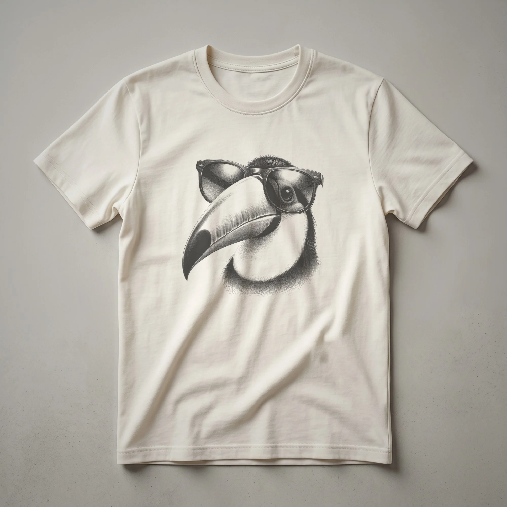 - This graphic tee showcases a vibrant line drawing of a toucan with a prominent beak, sporting cool sunglasses.
