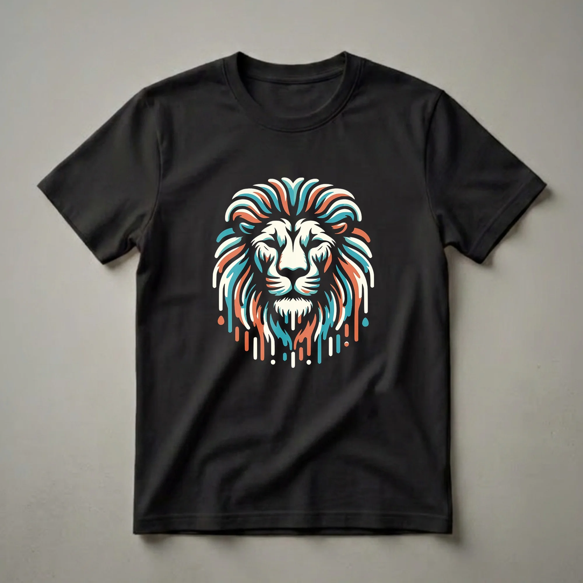 Lions, known as the 'king of the jungle,' are powerful symbols of courage and strength, and this graphic tee captures that essence with a vibrant, geometric design. The artwork features a lion's head rendered in a unique style, with bold lines and a dripping paint effect. The color palette includes striking shades of cream, teal, and burnt orange, creating an eye-catching visual that stands out against the black background of the shirt. This t-shirt is a thoughtful gift for any animal lover, particularly those who appreciate bold artistic interpretations of wildlife. It's a go-to tee for anyone who wants to express their admiration for these magnificent creatures. Wear this shirt to casual outings, art events, or simply when you want to add a touch of wild elegance to your everyday style. The lion's mane, depicted with flowing, colorful strokes, adds a dynamic feel to the overall composition, making this shirt a conversation starter for fellow admirers of big cats and unique graphic art.