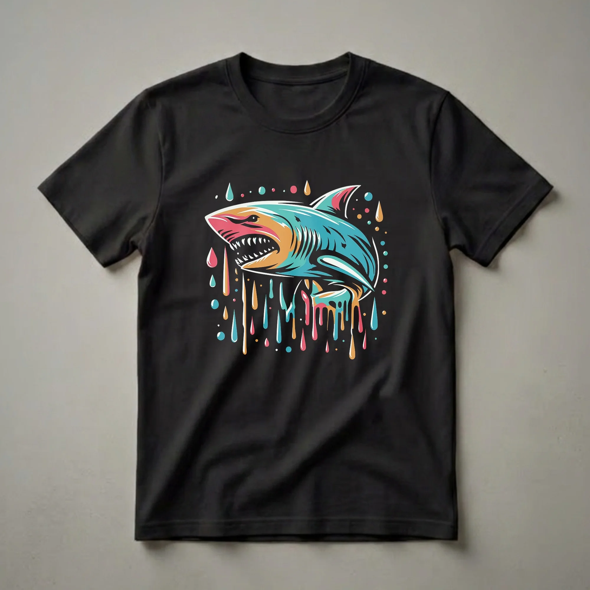 Ocean lovers and admirers of bold graphic art will gravitate towards this striking t-shirt featuring a vibrant, geometric shark. The design showcases a shark in profile, rendered in a palette of coral pink, golden orange, and teal blue, with sharp, angular lines that give it a modern, artistic feel. Below the shark, colorful drips of paint cascade downwards, mimicking water or perhaps a vibrant, abstract representation of the ocean's energy. Sharks, apex predators of the marine world, are known for their incredible speed and powerful presence, often inspiring awe and fascination. This tee captures that dynamic spirit with its unique artistic interpretation. It's a fantastic way for anyone who appreciates marine biology or simply loves unique apparel to express their passion. This shirt works well for casual outings, beach trips, or as a conversation starter. It makes a thoughtful gift for the shark enthusiast in your life who appreciates distinctive and colorful artwork. Wear this graphic tee to express your fascination with these magnificent ocean creatures.