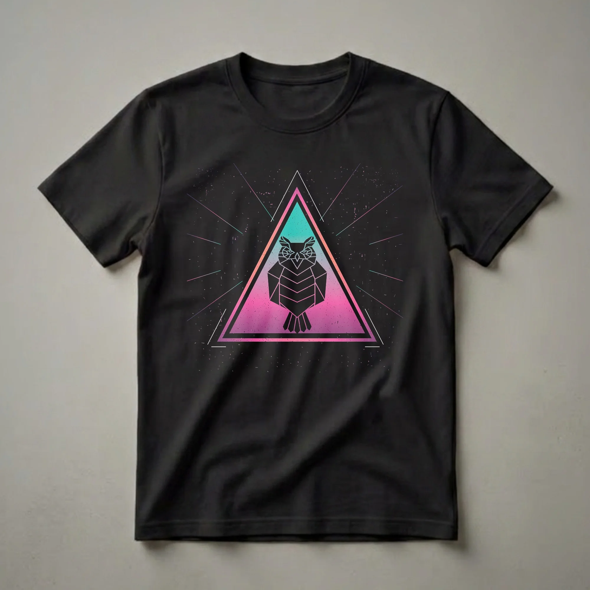 Retro style enthusiasts and lovers of unique animal art will appreciate this striking t-shirt. The design features a stylized owl rendered in geometric shapes, enclosed within a vibrant triangle that transitions from teal to pink. Thin, radiating lines in complementary colors emanate from the triangle, set against a black background speckled with white and pink flecks, evoking a retro, cosmic feel. Owls, known for their nocturnal habits and keen eyesight, are often symbols of wisdom and mystery. This graphic tee captures that enigmatic quality with its sharp, angular design. It's a thoughtful gift for anyone who appreciates bold, artistic apparel or has a fascination with owls and geometric patterns. This shirt works well for casual outings, art events, or simply expressing a distinctive personal style. Wear it to a concert or a casual meet-up with friends to spark conversation about its eye-catching design. This t-shirt is a staple for those who want to stand out.
