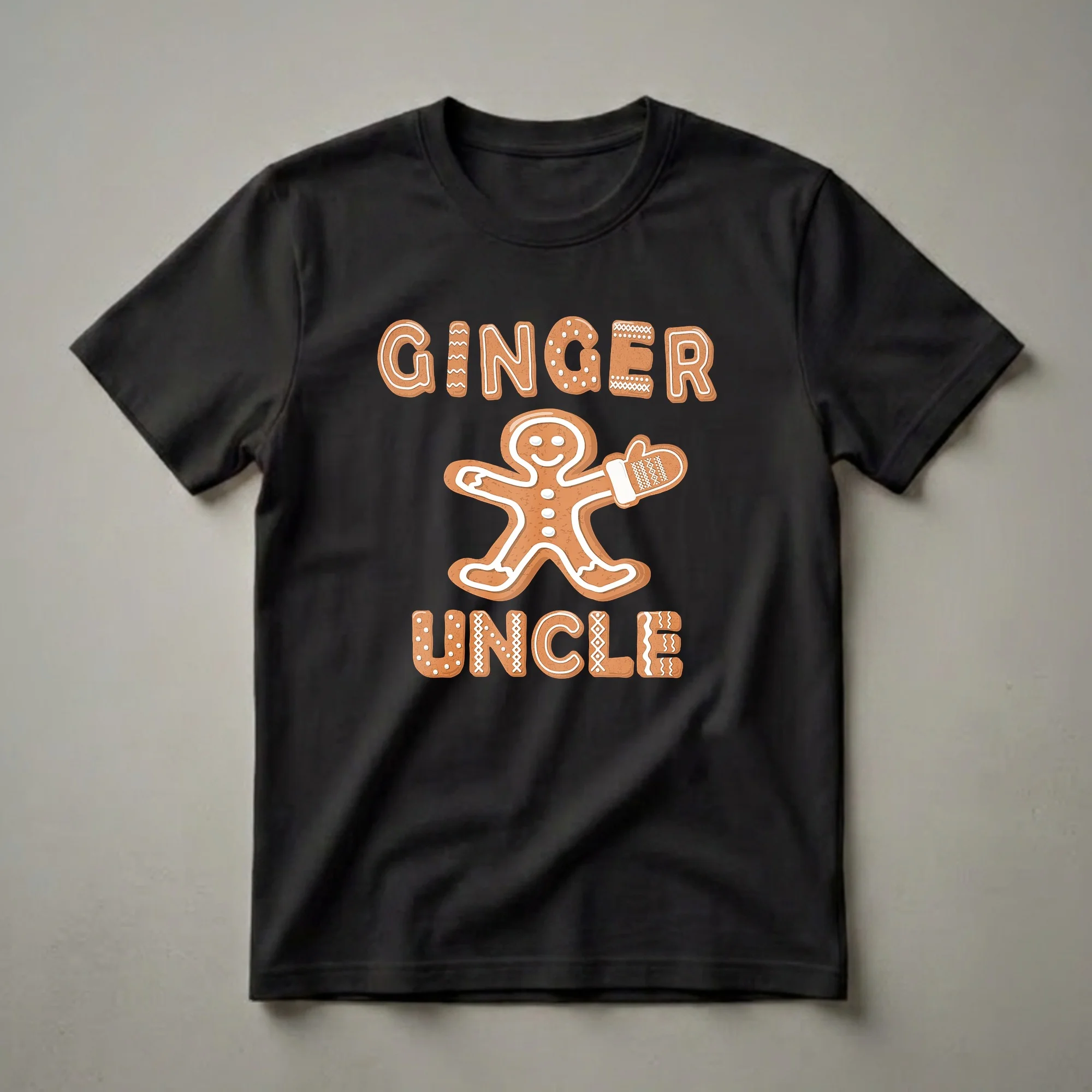 Gingerbread cookies are a beloved holiday tradition, often baked and decorated by families during the Christmas season. This festive tee captures that spirit with a playful gingerbread man design. The words "GINGER UNCLE" are presented in a charming gingerbread font, complete with white icing details and decorative patterns like zigzags, dots, and cross-hatch stitches. The gingerbread man itself is depicted with a friendly smile, rosy cheeks, and a festive mitten on one hand, ready to spread holiday cheer. This shirt is a thoughtful gift for any uncle who enjoys the festive season and wants to join in on family matching Christmas outfits. It’s a fun way for him to show his holiday spirit at gatherings, Christmas morning, or during holiday movie marathons. The design is eye-catching and evokes the sweet, warm feelings associated with Christmas baking and family togetherness. This t-shirt is a great way for uncles to coordinate with nieces and nephews, creating memorable holiday photos and strengthening family bonds during the most wonderful time of the year. It’s a staple for any uncle looking to add a touch of holiday fun to his wardrobe.