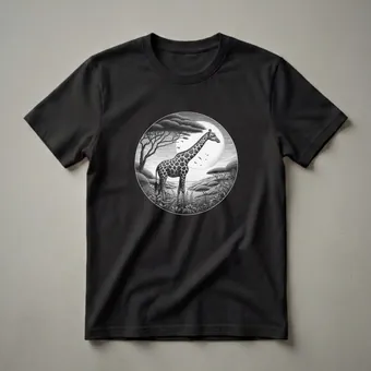 Wildlife enthusiasts who appreciate the beauty of the African savanna will reach for this unique graphic tee. The striking black and white artwork depicts a majestic giraffe standing tall amongst lush foliage, silhouetted against a large, textured moon. Acacia trees and rolling hills frame the scene, while birds soar in the expansive sky, evoking the vastness of the Serengeti. Giraffes, the tallest mammals on Earth, are known for their distinctive spotted coats and long necks, which allow them to reach leaves high in the trees. This shirt serves as a wonderful conversation starter for anyone who loves big cats, exotic animals, or the untamed wilderness. It makes a thoughtful gift for the nature lover in your life who dreams of safaris and encounters with the iconic wildlife of Africa. Wear this unique t-shirt on your next outdoor adventure or casual outing to showcase your passion for the natural world.