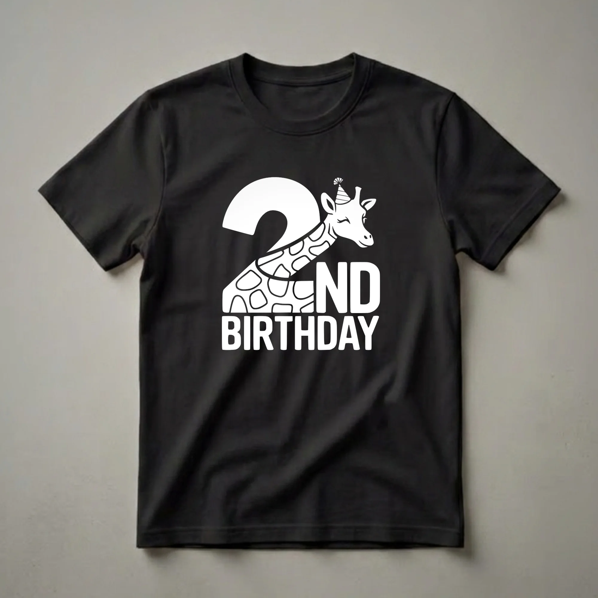 Two-year-olds are entering a vibrant stage of exploration and discovery, and this charming giraffe tee captures that spirit. The design prominently features a large, stylized number '2' in white, playfully integrated with a friendly giraffe. This gentle creature, known for its towering height and distinctive spotted pattern, wears a festive party hat, complete with a pom-pom, signaling a celebration. Below the graphic, the words '2ND BIRTHDAY' are clearly displayed in bold white lettering, making the occasion unmistakable. Giraffes, native to Africa, are the tallest living terrestrial animals, and their unique appearance makes them a favorite among young children. This t-shirt is a wonderful way for a child turning two to express their excitement for their special day. It's an ideal choice for a birthday party outfit or as a memorable gift for a toddler who loves animals. This graphic shirt is sure to bring smiles and make the birthday celebration even more memorable for the little one and their family.