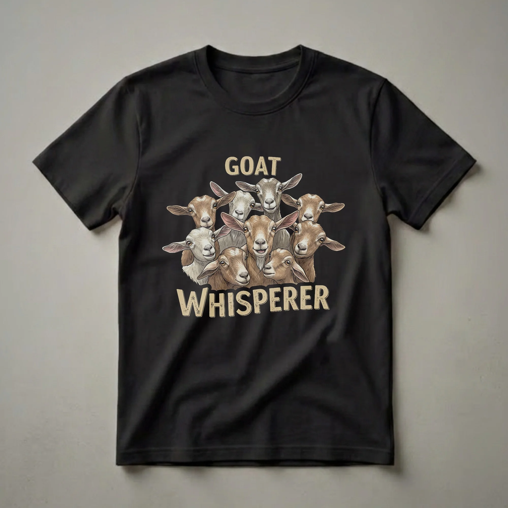 Goat owners know the unique personalities and intelligence of these farm animals. This eye-catching graphic tee features a collection of diverse goats, from playful kids to wise elders, all gathered together. The bold text 'GOAT WHISPERER' clearly states the wearer's affinity for these curious creatures. Goats are known for their agility and their ability to thrive in various environments, making them a staple on many farms. This shirt is a fantastic way for farmers, homesteaders, or anyone who cherishes their herd to express their passion. It makes a thoughtful gift for the goat farmer in your life, great to wear around the farm, to local markets, or during casual outings. This comfortable t-shirt is a staple for any goat lover's wardrobe, celebrating the bond between humans and these remarkable animals.