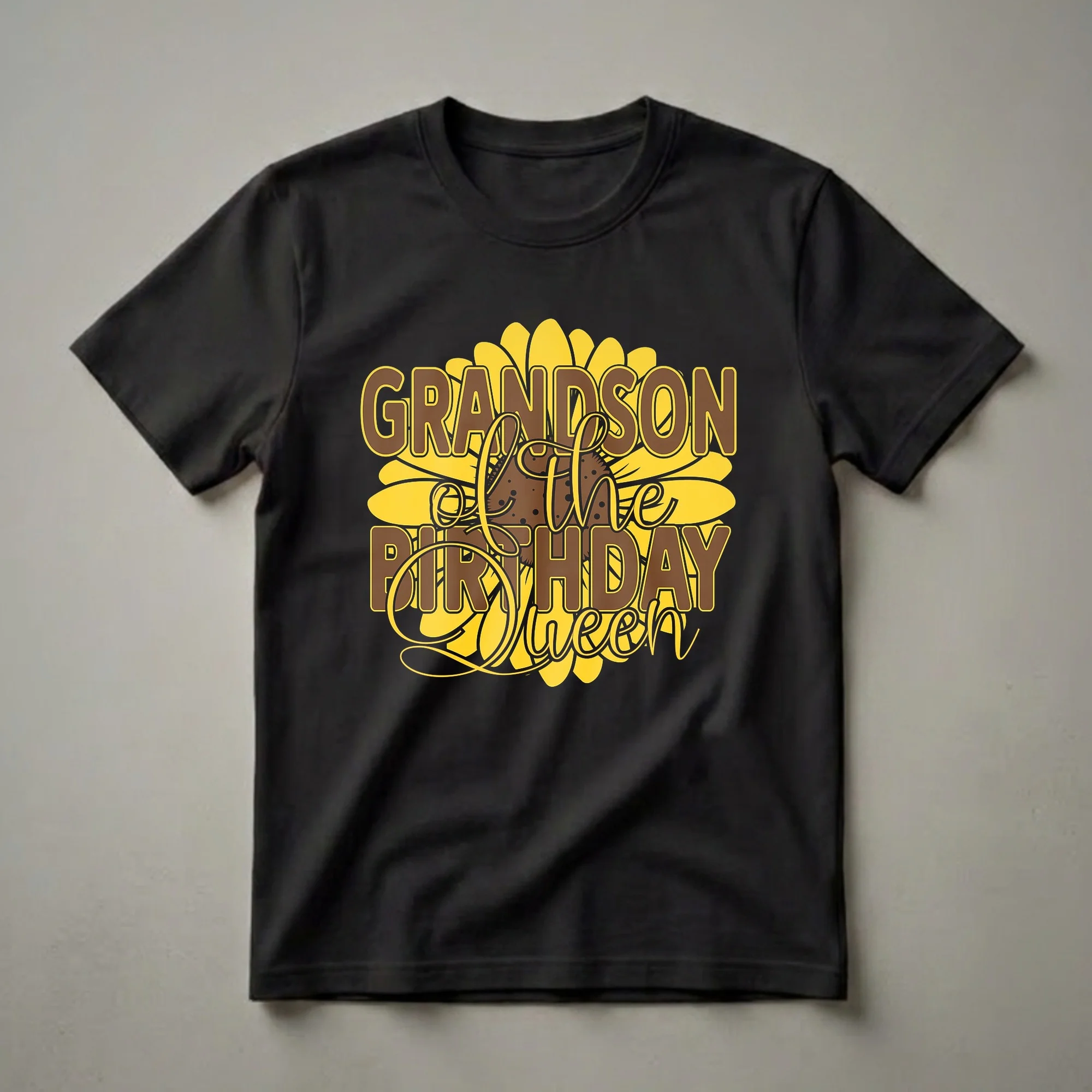 Celebrate the birthday queen by gifting her favorite grandson this vibrant sunflower graphic t-shirt announcing his special role. This eye-catching graphic tee is a fantastic way for any grandson to show his love and pride for the special woman celebrating her birthday. The design features bold, brown lettering that spells out 'GRANDSON of the BIRTHDAY Queen,' set against a vibrant, stylized sunflower. The sunflower, a symbol of adoration and loyalty, adds a cheerful and bright element to the shirt, making it stand out at any celebration. Sunflowers are known for turning their faces towards the sun, symbolizing positivity and warmth, much like a beloved grandmother or mother. This t-shirt is a thoughtful gift for grandsons who want to honor their grandmothers or mothers on their special day. Imagine the joy on her face when she sees her grandson proudly wearing this shirt to her birthday party or family gathering. It’s a perfect way for him to participate in the celebration and show he’s part of the royal birthday court. This tee works well for grandsons of all ages who want to be part of the birthday festivities. It’s a comfortable and stylish piece of apparel that he will reach for again and again, especially during birthday season.