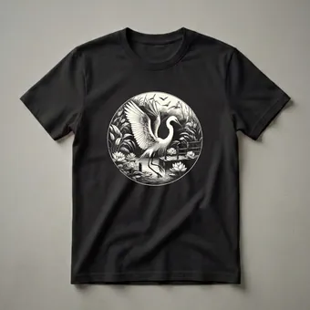 Birdwatchers and nature enthusiasts will appreciate the intricate detail of this graphic tee, which depicts a majestic great egret in a serene wetland scene. The illustration captures the bird mid-stride, its long legs stepping carefully through the water among blooming lily pads. In the background, tall reeds and a rustic wooden dock suggest a peaceful natural environment, while a few smaller birds take flight overhead. Great egrets, known for their striking white plumage and elegant stature, are often found in marshes, swamps, and along coastlines, where they hunt for fish and amphibians. This t-shirt serves as a wearable piece of art, celebrating the beauty of these wading birds and their aquatic habitats. It makes a thoughtful gift for anyone who finds joy in observing wildlife or enjoys the tranquility of nature. Wear this shirt to your next birding expedition or simply as a conversation starter about your passion for ornithology.