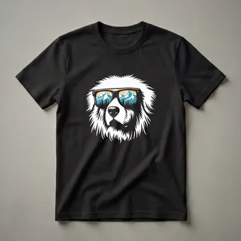Great Pyrenees owners who appreciate the majestic beauty of mountain landscapes will reach for this eye-catching graphic tee. The design features a stylized illustration of a Great Pyrenees dog, known for its impressive size and gentle demeanor, sporting cool sunglasses. The lenses of these sunglasses reflect a stunning mountain range with pine trees and a warm, setting sun, evoking a sense of adventure and freedom. This shirt is more than just apparel; it's a statement piece for those who love their large breed companions and the call of the wild. The Great Pyrenees breed originated in the Pyrenees Mountains between France and Spain, historically used as livestock guardians. This t-shirt makes a thoughtful gift for any Great Pyrenees mom or dad, or for anyone who enjoys hiking, camping, or simply admiring nature's grandeur. Wear this unique shirt on your next outdoor excursion or casual outing to spark conversations about your favorite breed and your love for the mountains. It's a staple in the collection for any dog enthusiast.