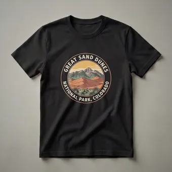 Great Sand Dunes National Park in Colorado offers a unique landscape where towering sand dunes meet the Sangre de Cristo Mountains. This striking graphic tee captures the essence of this natural wonder, featuring rolling sand dunes in warm, earthy tones against a backdrop of rugged, snow-capped peaks under a hazy, golden sky. The design is framed by a circular emblem with the park's name and location, 'Great Sand Dunes National Park, Colorado,' in a classic retro font. This shirt is a thoughtful gift for hikers, campers, and outdoor enthusiasts who appreciate the dramatic scenery and adventurous spirit of this Colorado gem. It's a go-to tee for anyone who has explored the park's vast sandy expanses or dreams of visiting. Wear it on your next outdoor excursion or as a reminder of your travels. The Great Sand Dunes are the tallest sand dunes in North America, a testament to the powerful geological forces that shaped this region over millennia. This apparel serves as a wearable memento for those who cherish the wild beauty of America's national parks. Whether you're planning a trip or reminiscing about past adventures, this t-shirt connects you to the majesty of Great Sand Dunes.