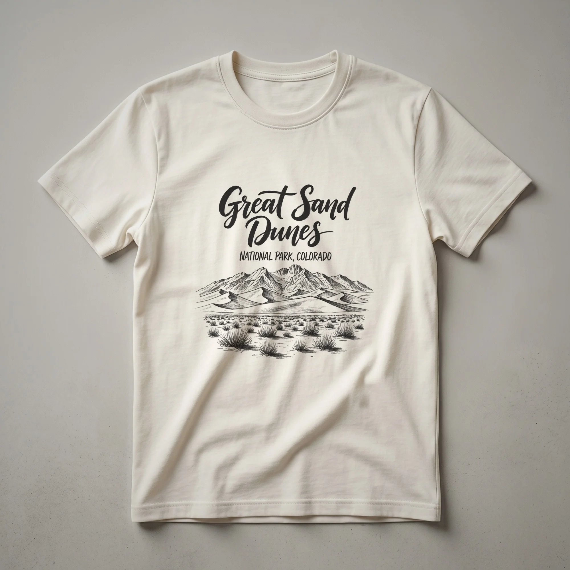 - Graphic t-shirt featuring a sketch of Great Sand Dunes National Park, Colorado.