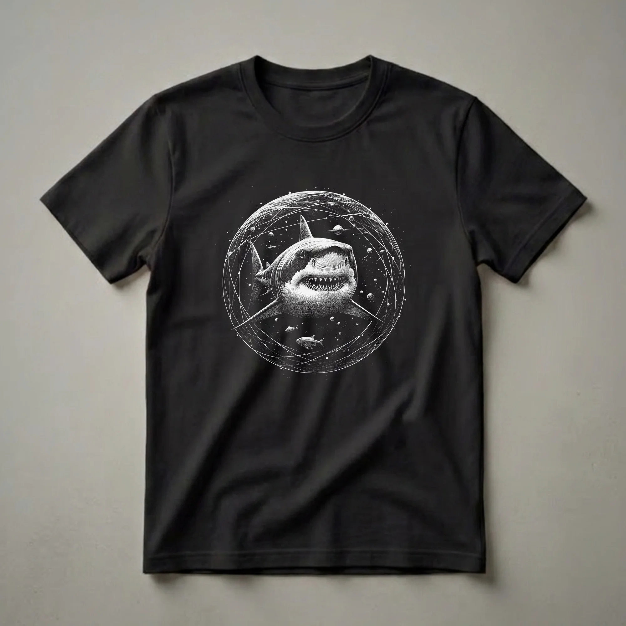 Ocean lovers and marine enthusiasts will appreciate the striking detail of this graphic tee, which features a great white shark at its center. The artwork depicts the apex predator within a circular, cosmic-themed bubble, complete with swirling lines, planets, and smaller fish. This design captures the awe-inspiring power of sharks, creatures that have roamed the oceans for millions of years, playing a vital role in maintaining marine ecosystem balance. Great white sharks, known for their impressive size and hunting prowess, are found in coastal waters worldwide, from the temperate zones to the subtropics. This t-shirt is a thoughtful gift for anyone fascinated by the ocean's mysteries and its most iconic inhabitants. It's a go-to tee for casual outings, beach trips, or simply expressing your passion for marine biology. Wear this shirt to spark conversations about ocean conservation and the importance of these magnificent animals. The detailed linework and dramatic composition make this shirt a standout piece for any wardrobe, a thoughtful choice for divers, marine biologists, or anyone who feels a connection to the sea.