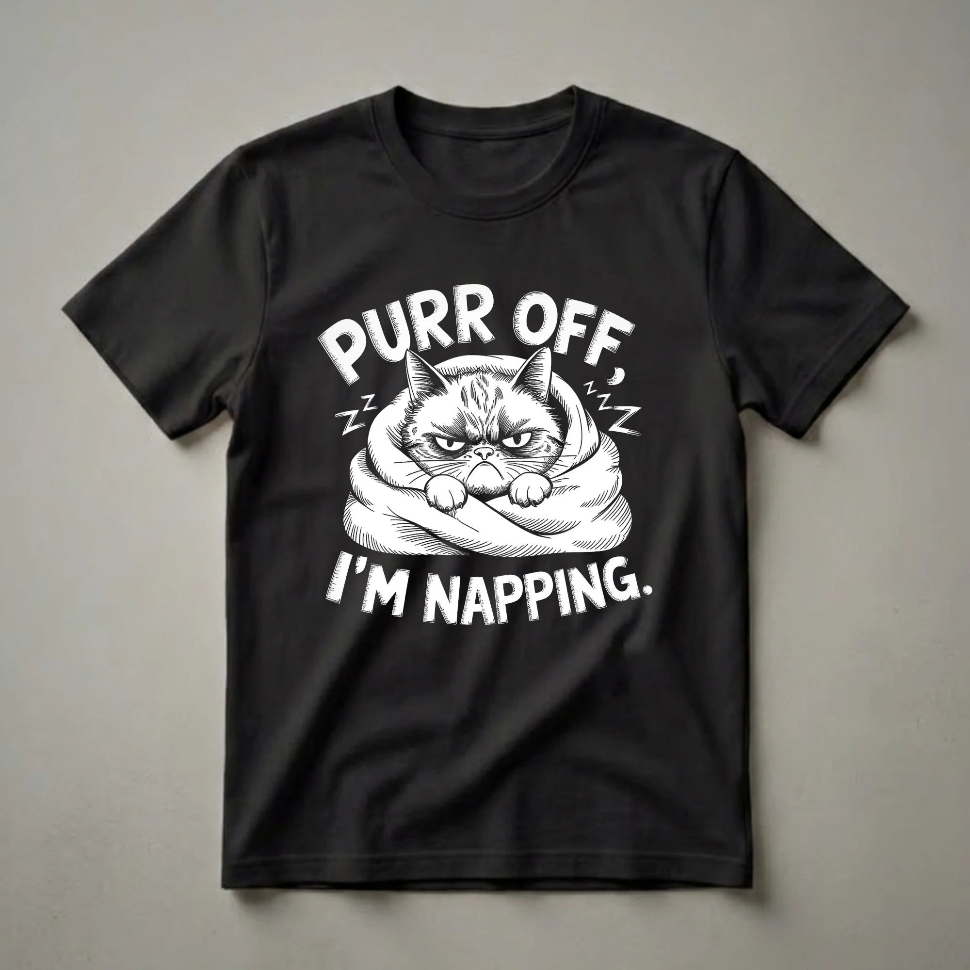 Cat moms and cat dads who appreciate a feline's dedication to sleep will reach for this humorous t-shirt. The design features a grumpy-looking cat, meticulously sketched and wrapped snugly in a blanket, with its paws resting on the edge. Above the feline's unimpressed face, bold white letters declare 'PURR OFF,' while below, the equally emphatic 'I'M NAPPING.' completes the sentiment. This graphic tee captures the essence of a cat's desire for uninterrupted rest, a behavior many cat owners observe daily. Cats, known for their ability to sleep up to 16 hours a day, often find the most peculiar and comfortable spots for their naps. This shirt makes a thoughtful gift for any cat lady or gentleman who understands the sacredness of a cat's naptime. It's a perfect way to express your own love for lounging and perhaps a gentle hint to others to let you sleep. Wear this tee while enjoying a quiet morning, a lazy afternoon, or simply when you want to showcase your feline-inspired lifestyle.