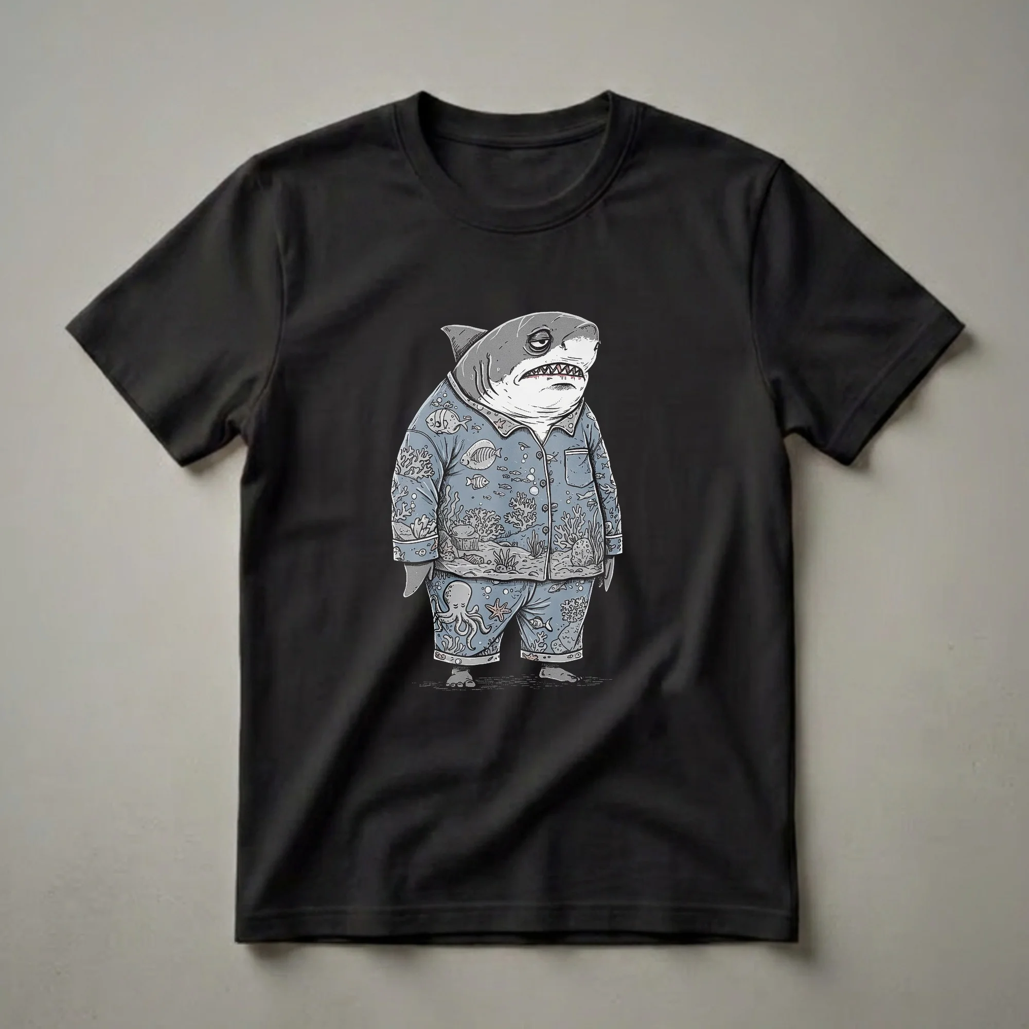 Shark lovers who appreciate a good laugh will reach for this eye-catching tee. The graphic showcases a grumpy-looking shark, complete with tired eyes and a slightly menacing grin, sporting a full set of blue pajamas. These pajamas are adorned with a whimsical underwater scene, featuring a variety of fish, coral formations, an octopus, and starfish. The detail in the print brings the ocean floor to life, contrasting humorously with the shark's evident lack of enthusiasm. Sharks, as apex predators, are fascinating creatures known for their powerful presence in marine ecosystems. This shirt captures a more relatable, perhaps even sleepy, side of these ocean dwellers. It’s a playful take on the typical portrayal of sharks, offering a humorous visual for anyone who enjoys marine life with a twist. This t-shirt makes a thoughtful gift for men, women, and kids who love sharks or simply enjoy a quirky, conversation-starting piece of apparel. Wear it to your next casual get-together, game night, or just while lounging at home for a touch of underwater charm and a good chuckle.