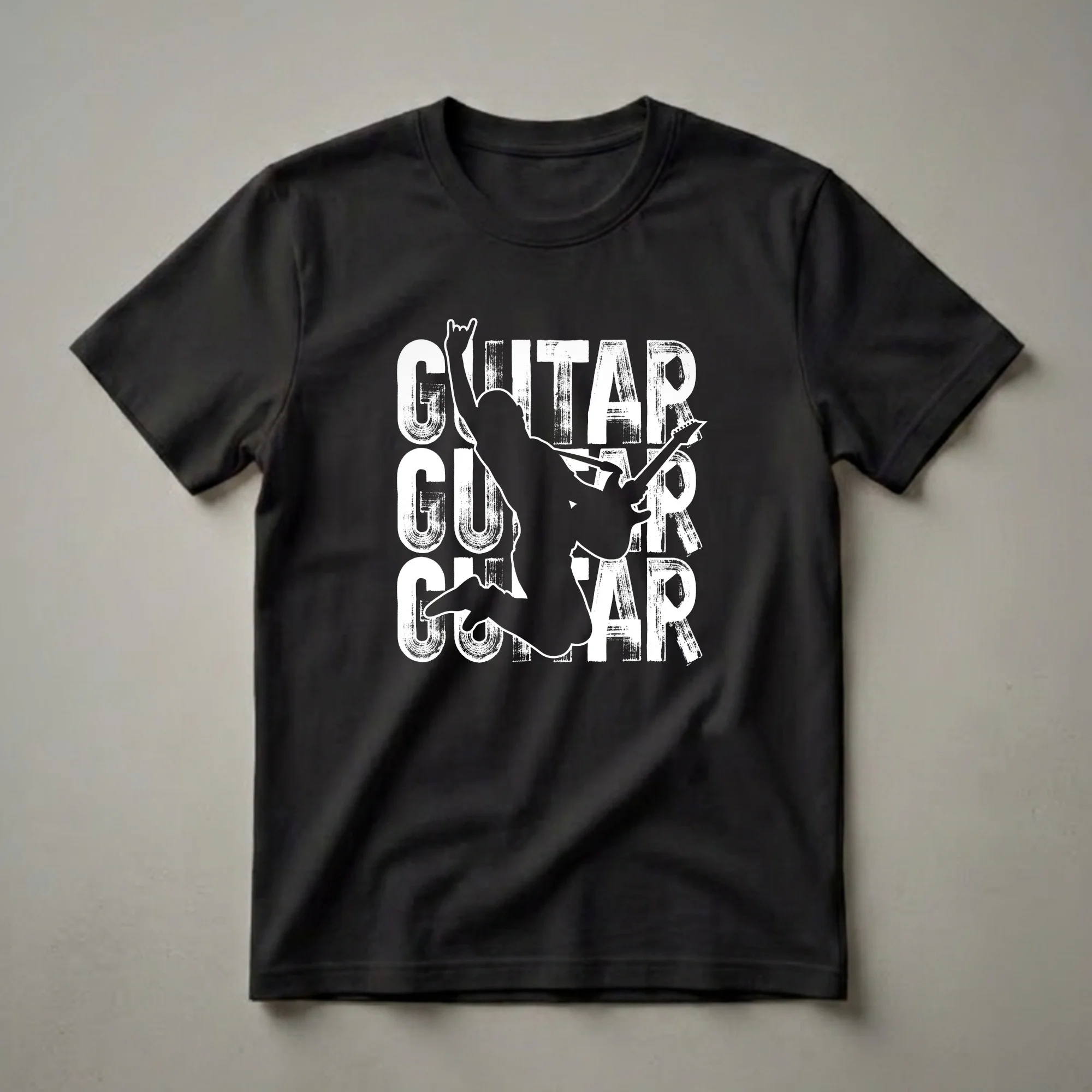 Guitarists who live for the stage will reach for this eye-catching tee. The design features a dynamic black silhouette of a musician in mid-air, performing a rock 'n' roll hand gesture while holding an electric guitar. Behind the silhouette, the word 'GUITAR' is emblazoned three times in a distressed, brushstroke-style white font, creating a powerful visual statement. This shirt is a testament to the energy and passion that defines guitar playing, from blues riffs to heavy metal solos. Guitars, whether acoustic or electric, are versatile instruments capable of producing a vast range of sounds, making them central to countless music genres. This t-shirt is a thoughtful gift for any guitarist, music student, or band member who wants to express their love for their instrument. Wear it to band practice, a concert, or casual outings to let everyone know where your musical heart lies. It's a staple in the collection for any serious guitar enthusiast.