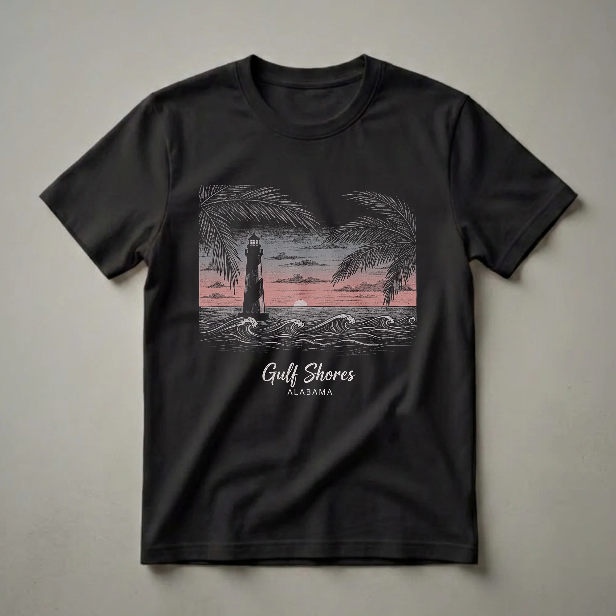 Gulf Shores, Alabama, a popular vacation destination on the Gulf Coast, is beautifully represented in this striking graphic tee. The design features a classic lighthouse standing tall against a vibrant sunset sky, with dramatic waves crashing on the shore. Palm fronds frame the scene, evoking a tropical, relaxed atmosphere. This shirt is a thoughtful gift for anyone who has visited Gulf Shores, cherishes memories of its beaches, or dreams of a coastal getaway. The artwork's linocut style adds a vintage, artistic touch, making it a unique piece of apparel. Whether you're a resident, a frequent visitor, or simply appreciate coastal art, this t-shirt serves as a wearable memento of Alabama's beautiful shoreline. Wear it to remember your last beach vacation or to inspire your next trip to the Gulf Coast. The text 'Gulf Shores ALABAMA' is prominently displayed, solidifying the location's identity. This tee works well for casual outings, beach days, or as a conversation starter among fellow travelers.