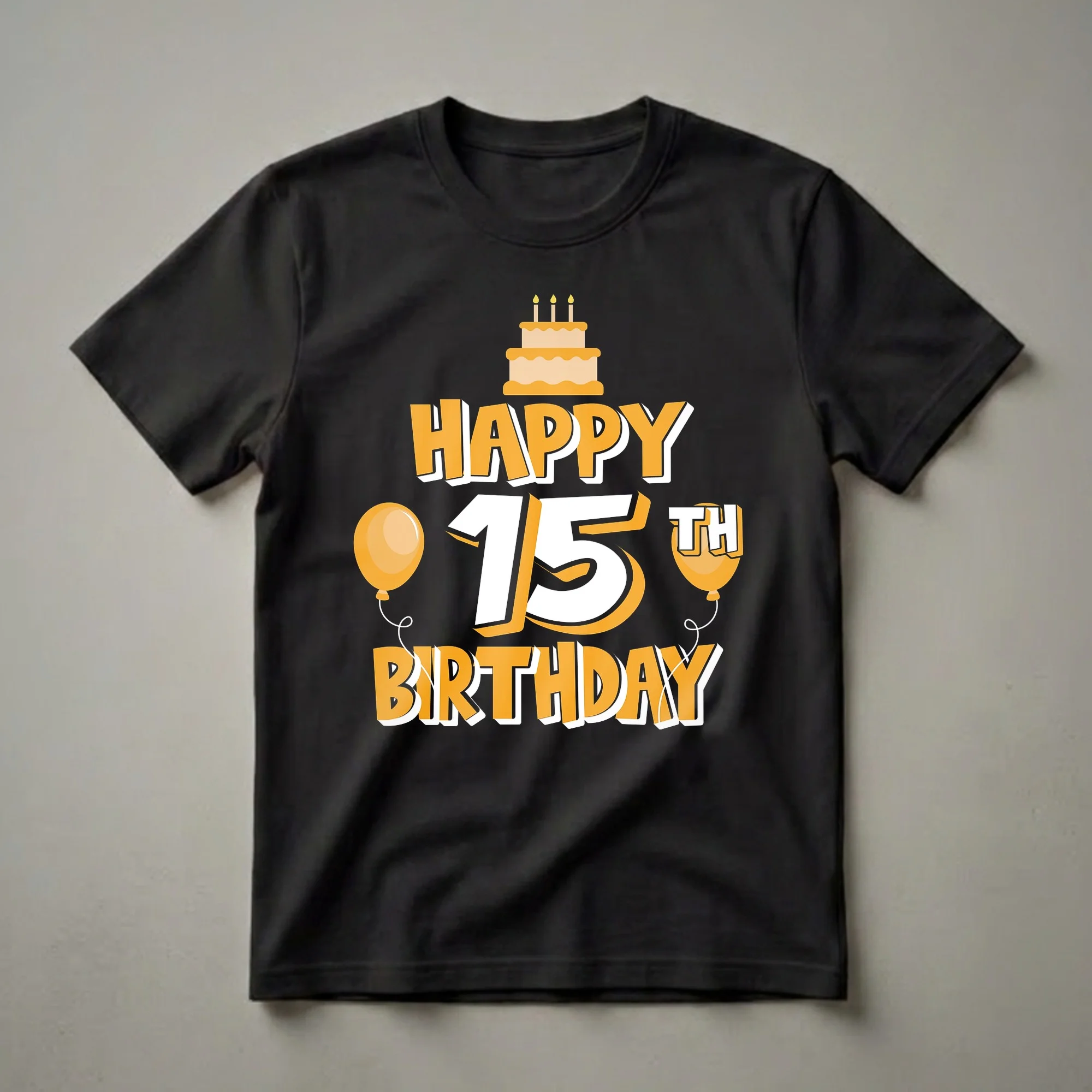 Celebrate your fifteenth birthday with this vibrant graphic tee, featuring a fun cake, balloons, and bold "Happy 15th Birthday" messaging.This graphic tee captures the excitement of this special birthday with its eye-catching design. The prominent "HAPPY 15TH BIRTHDAY" text is rendered in a bold, playful font with a striking orange and white color scheme, outlined in black for maximum impact. Above the main text sits a cheerful, two-tiered birthday cake topped with three candles, symbolizing wishes and celebration. Flanking the large "15" are two bright orange balloons, adding a festive and celebratory atmosphere to the overall design. This t-shirt is a fantastic way for any teen celebrating their 15th birthday to express their joy and excitement. It's a thoughtful gift idea for parents, friends, or family members looking to make the birthday person feel extra special. This shirt works well for birthday parties, family gatherings, or even just as a fun everyday tee to commemorate this memorable age. The vibrant design is sure to be a hit with anyone entering their mid-teens.