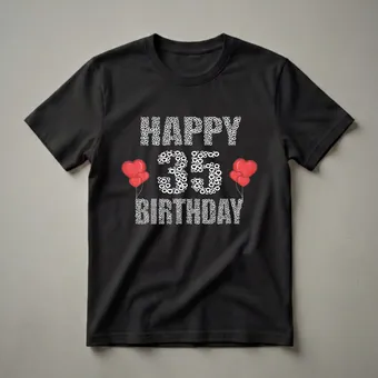 Turning 35 marks a significant milestone, a blend of established adulthood and continued vibrancy. This graphic tee captures that celebratory spirit with its eye-catching design. The words 'Happy 35th Birthday' are artfully constructed from a mosaic of small white hearts and circles, creating a textured and visually engaging effect. Flanking the central '35' are clusters of bright red heart-shaped balloons, adding a festive and joyful touch. This t-shirt is a fantastic way for anyone celebrating their 35th birthday to express their excitement and mark the occasion. It’s a thoughtful gift for a friend, family member, or partner who is reaching this special age. Imagine them wearing this shirt to their birthday dinner, a casual get-together, or even just to lounge at home while reflecting on their journey. The design is bold yet playful, making it a versatile piece of apparel for any birthday celebration. This shirt is a wearable memento of a milestone year, made for creating lasting memories.