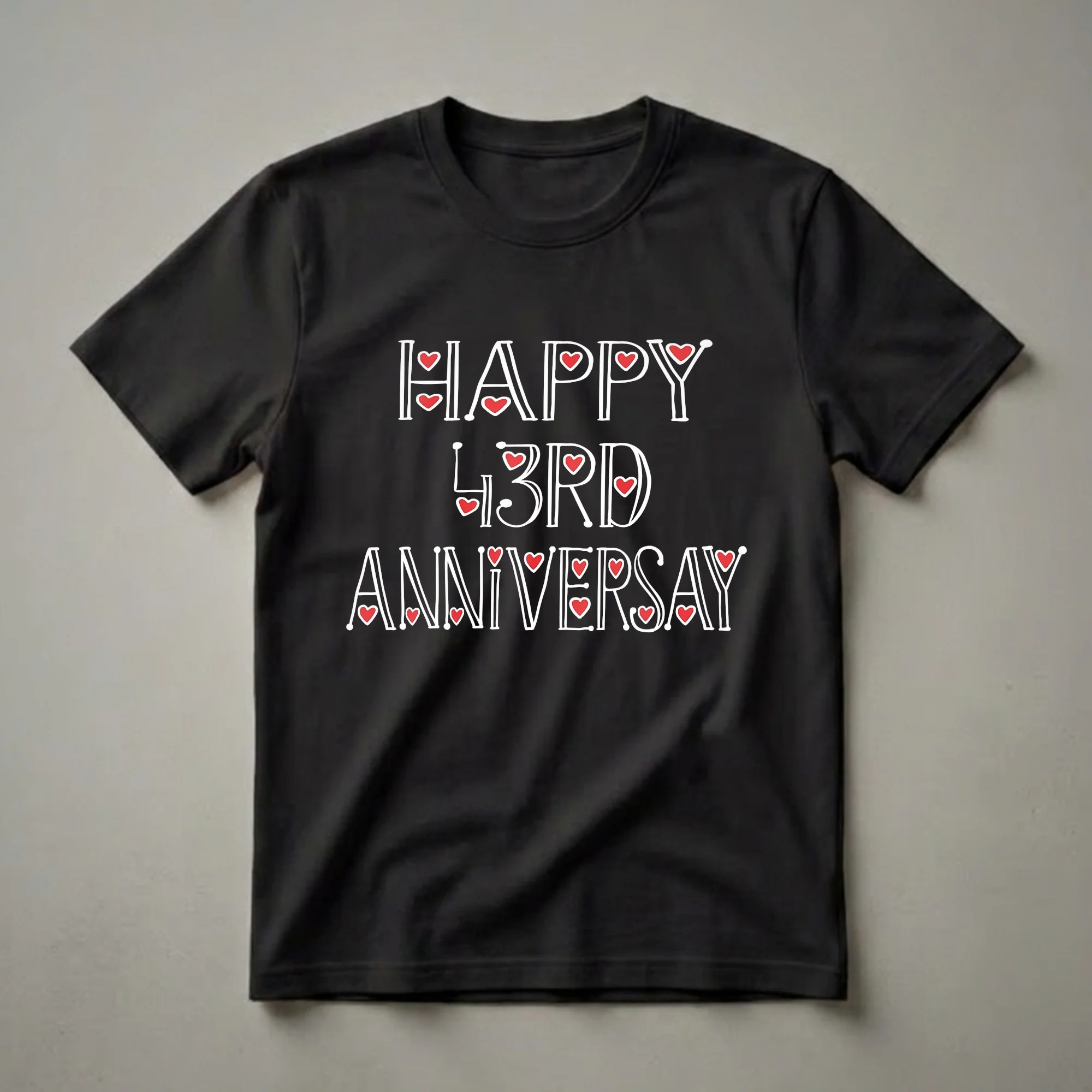 Celebrating 43 years together is a remarkable achievement, and this "Happy 43rd Anniversary" t-shirt is a wonderful way for couples to commemorate their journey. The design features bold white lettering with playful red hearts integrated into the text, creating a festive and loving visual. The phrase "43 Years Together" is prominently displayed, emphasizing the enduring bond shared by the couple. This shirt is a perfect statement piece for anniversary celebrations, whether it's a quiet dinner at home or a larger gathering with family and friends. It serves as a constant reminder of the commitment and love that has grown over nearly five decades. For couples reaching this significant milestone, this tee offers a comfortable and stylish way to showcase their lasting partnership. It also makes a thoughtful gift for parents or grandparents celebrating their 43rd anniversary, allowing them to wear their love proudly. This anniversary shirt is a staple for any couple marking this special occasion.