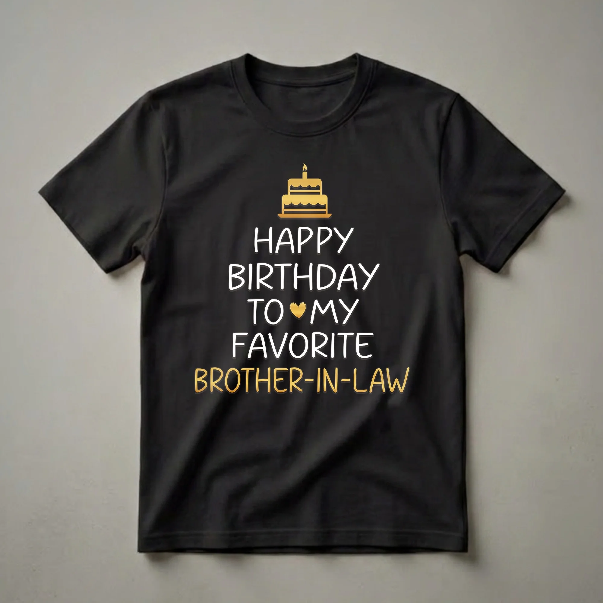 This black t-shirt features a festive design for a brother-in-law's birthday. At the top, a golden birthday cake with a lit candle sits above bold white text that reads "HAPPY BIRTHDAY TO MY". Below this, a golden heart replaces the word 'LOVE', followed by "FAVORITE" in white, and finally "BROTHER-IN-LAW" in striking gold lettering. This shirt is a thoughtful gift for any sister-in-law or brother-in-law looking to celebrate a special family member. Birthdays are milestones that bring families together, and this tee is a fun way to acknowledge the bond you share. It's a great conversation starter at any birthday gathering, whether it's a casual get-together or a more formal party. This graphic tee is sure to bring a smile to his face on his special day. Consider this shirt as a unique birthday present for the brother-in-law who has everything. It's a wearable declaration of affection and a reminder of your close relationship.