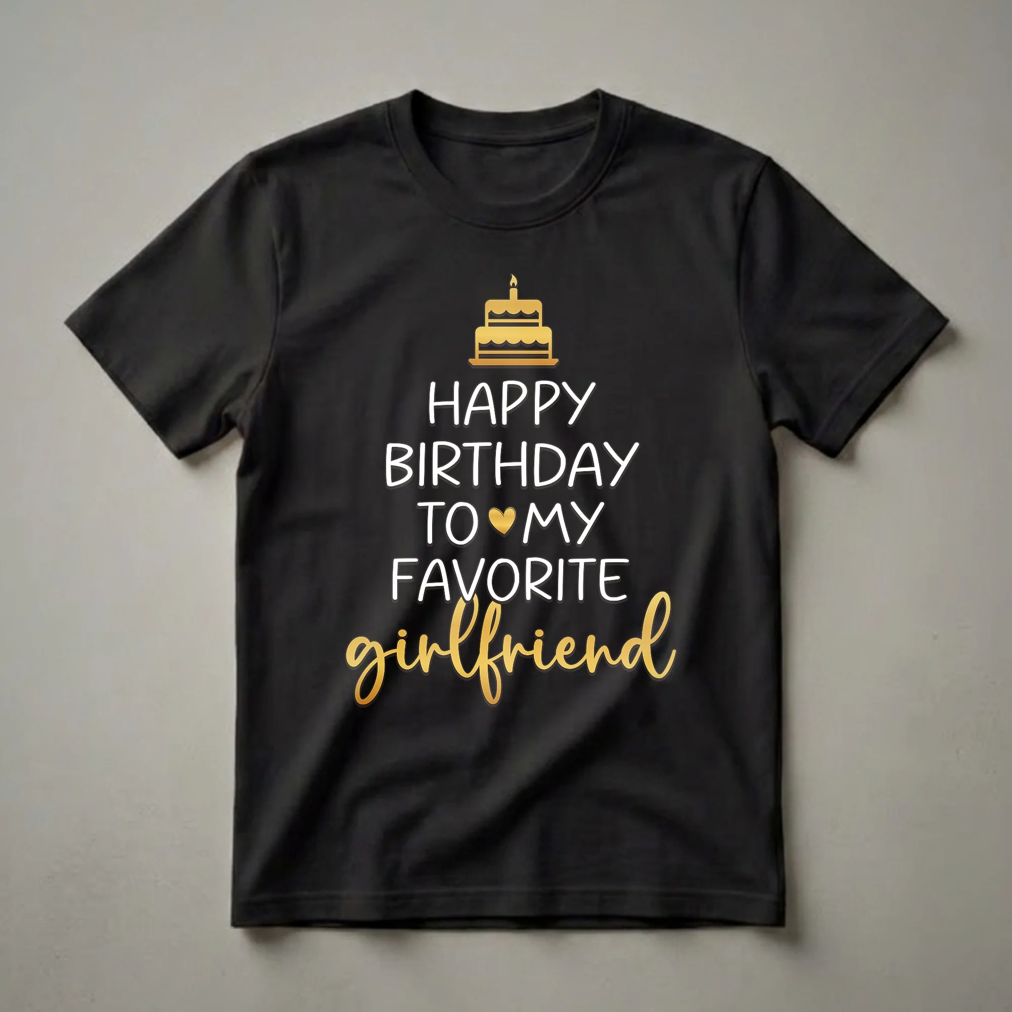 This black t-shirt features a festive birthday graphic suited for a girlfriend. At the top, a golden birthday cake with a lit candle sits above bold white text that reads "HAPPY BIRTHDAY TO MY". Below this, a golden heart replaces the word 'MY', followed by "FAVORITE". The word "girlfriend" is written in a flowing, elegant gold script at the bottom. This shirt is a thoughtful gift for any girlfriend celebrating her birthday, whether it's a milestone year or just another reason to celebrate. It's a fun way for a boyfriend or partner to show appreciation and make her feel special on her big day. Imagine her wearing this tee to a birthday brunch or a casual party, spreading birthday cheer. This graphic tee is a staple for anyone looking to give a unique and personal birthday present. It’s a wearable declaration of affection, made for making her birthday memorable and fun.