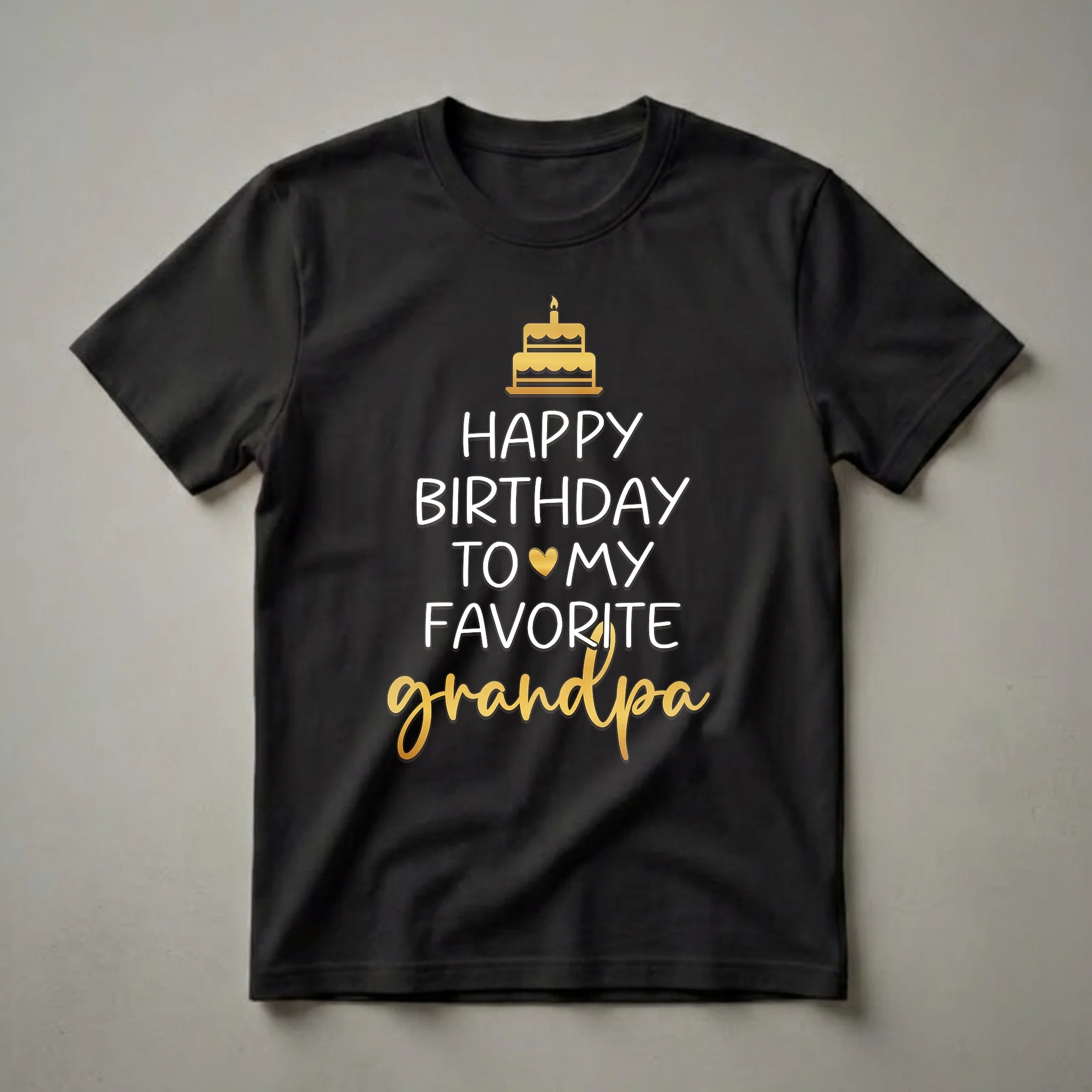 Grandparents hold a special place in our hearts, and birthdays are the ideal time to show them how much they mean. This graphic tee is designed to celebrate that special bond with a beloved grandpa. The design prominently features the words "HAPPY BIRTHDAY TO MY FAVORITE" in bold white lettering, with a golden heart subtly placed between "MY" and "FAVORITE." Below this, the word "grandpa" is written in an elegant, flowing gold script, adding a touch of sophistication. Above the text sits a stylized golden birthday cake, complete with a lit candle, symbolizing celebration and joy. This shirt is a wonderful way for grandchildren to express their affection and make their grandpa feel cherished on his special day. It's a thoughtful gift idea for any grandfather who loves to be celebrated, whether for his birthday or any occasion. Imagine him wearing this tee to a family gathering or a casual birthday brunch, bringing smiles to everyone's faces. This comfortable t-shirt serves as a wearable declaration of love and appreciation, making it a go-to item for any grandchild wanting to honor their favorite grandpa.