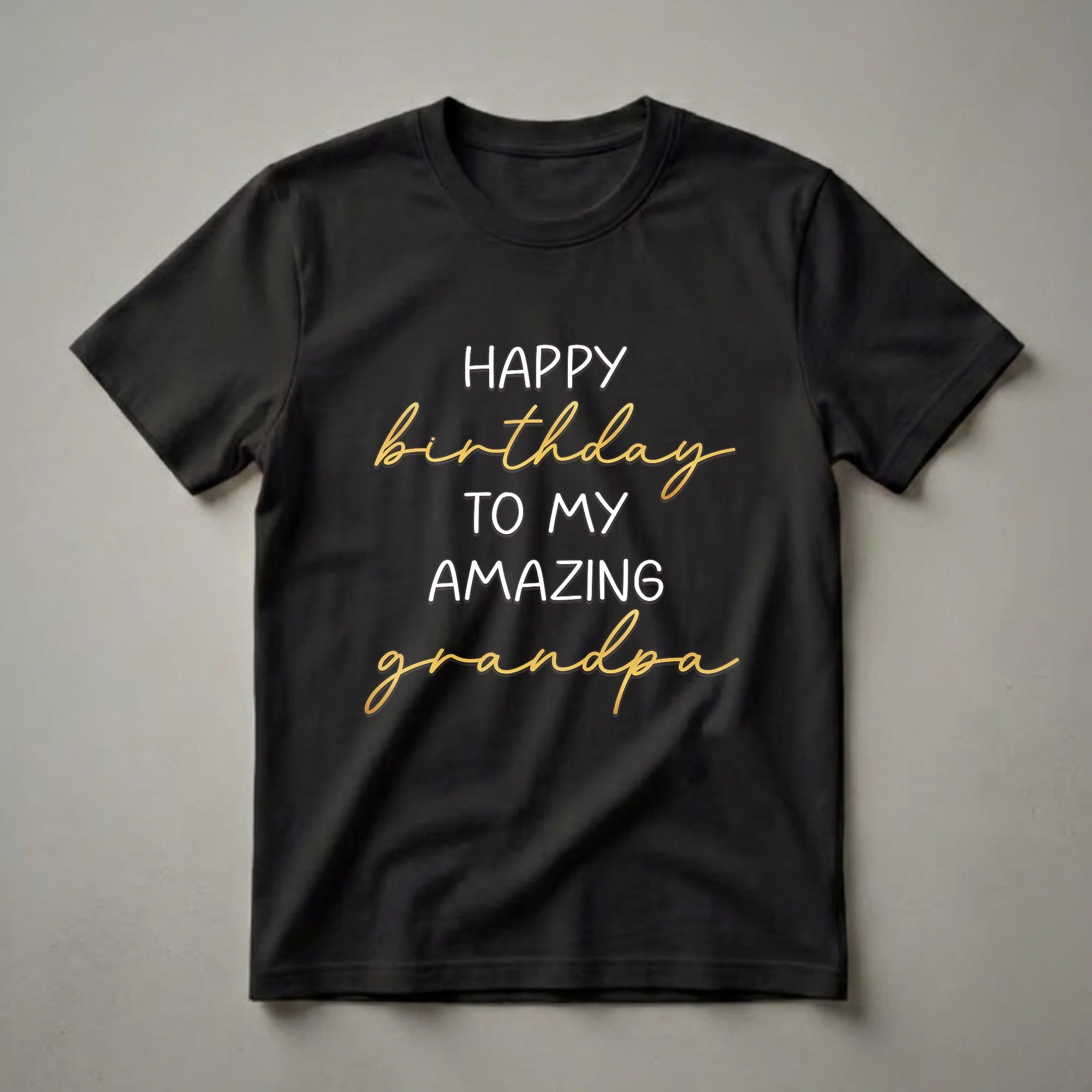 Grandparents hold a special place in our lives, and celebrating their birthdays is a joyous occasion. This graphic t-shirt proudly declares 'Happy Birthday To My Grandpa' in a stylish combination of white and shimmering gold lettering against a classic black background. The design features bold, clean sans-serif font for 'HAPPY', 'TO MY', and 'GRANDPA', contrasted with an elegant, flowing script for 'birthday'. This tee is a wonderful way for grandchildren to express their love and appreciation for their grandfather. It makes a thoughtful gift for any grandpa celebrating a milestone birthday, a family gathering, or just because. Imagine him wearing this shirt to his birthday party, a family brunch, or even just while relaxing at home, knowing he's cherished. This shirt is a staple for any grandchild looking to make their grandpa feel extra special on his big day. It's more than just apparel; it's a wearable declaration of love and admiration for the best grandpa out there. This birthday shirt is a go-to choice for showing him how much he means to you.